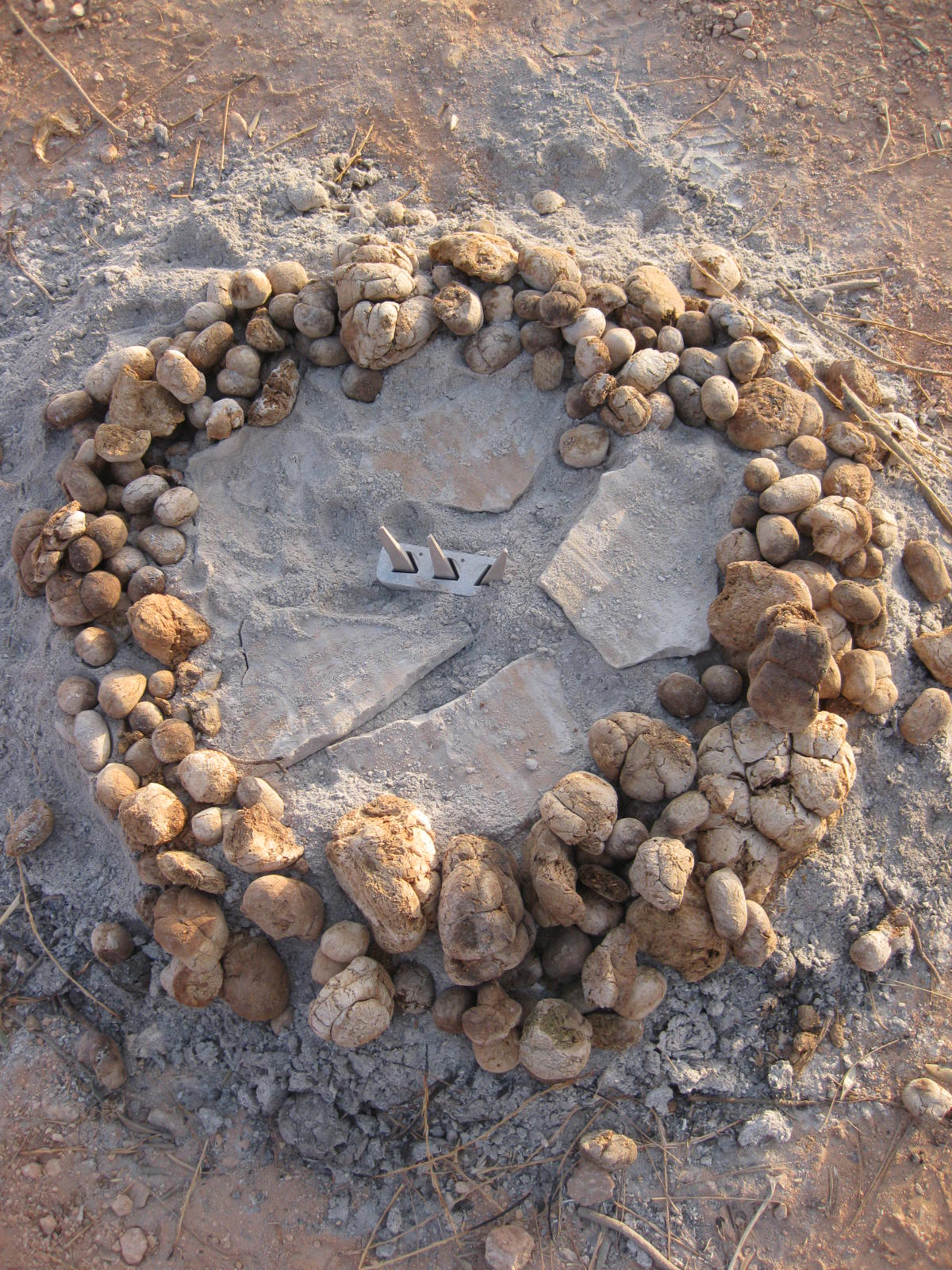 There were small adjustments in the following six firings. Small amounts of sheep dung were included with the camel dung based on discussions about sheep dung with Bedouin women in Jordan and an Acoma potter in New Mexico. They suggested that sheep dung would raise the temperature and increase oxygen in the firings.