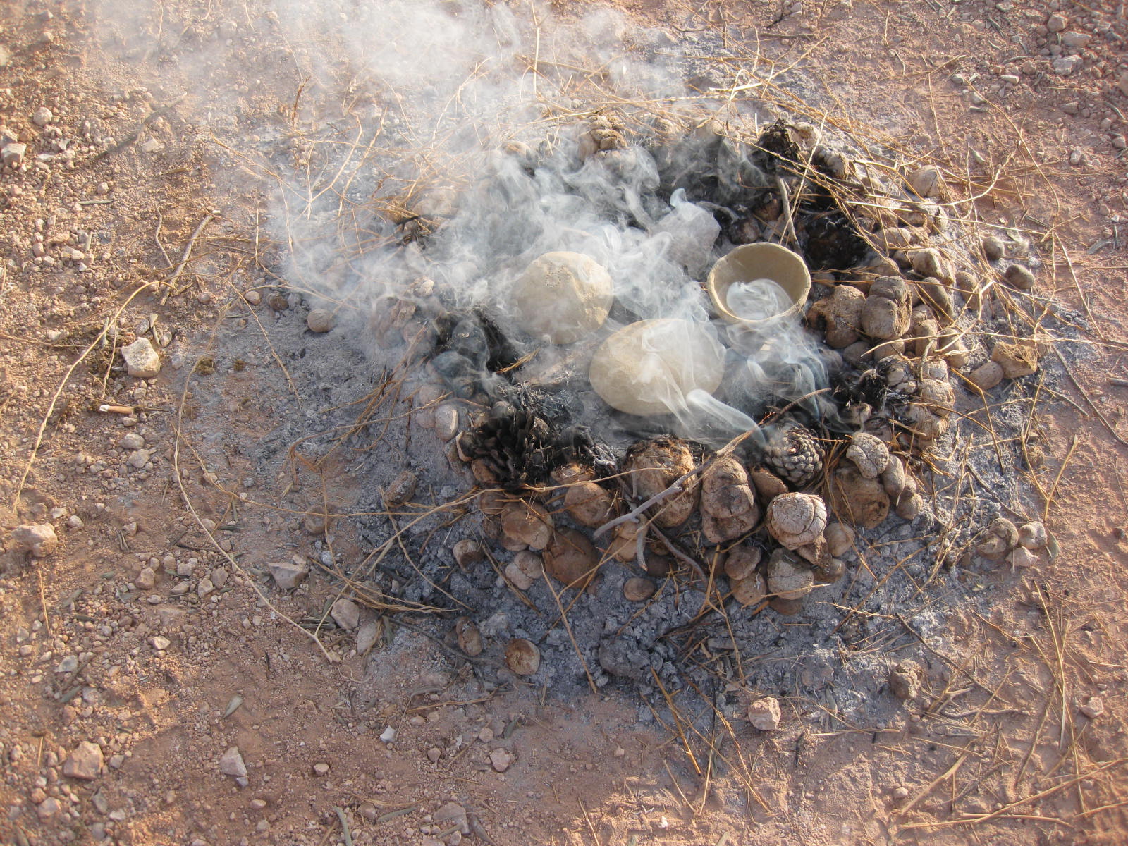 We cleared the hearth area of stones and other material that might interfere with firing. We quickly used up all fire-starters of dried grasses and shrubs in the immediate area and expanded our search into a nearby valley where we gathered pine twigs, needles, and cones.