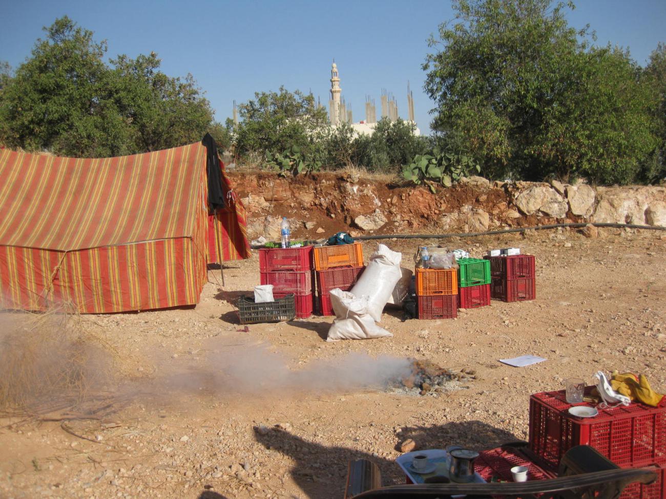 We secured a location for the pottery firings on an undeveloped private lot in the small town of al Fasalia, central Jordan, about a half hour from our base in Madaba (See Figure 1). Situated on the road to Mount Nebo and the Dead Sea, the property was surrounded on three sides by earthen cliffs, so the firing hearth was protected from the wind and could be left undisturbed to cool overnight. We had a small tent for protection from the sun and to protect supplies and equipment from evening moisture. Twenty plastic crates were stacked for tables and a few plastic chairs were easily moved around to keep the team out of the sun and the smoke of burning camel dung.