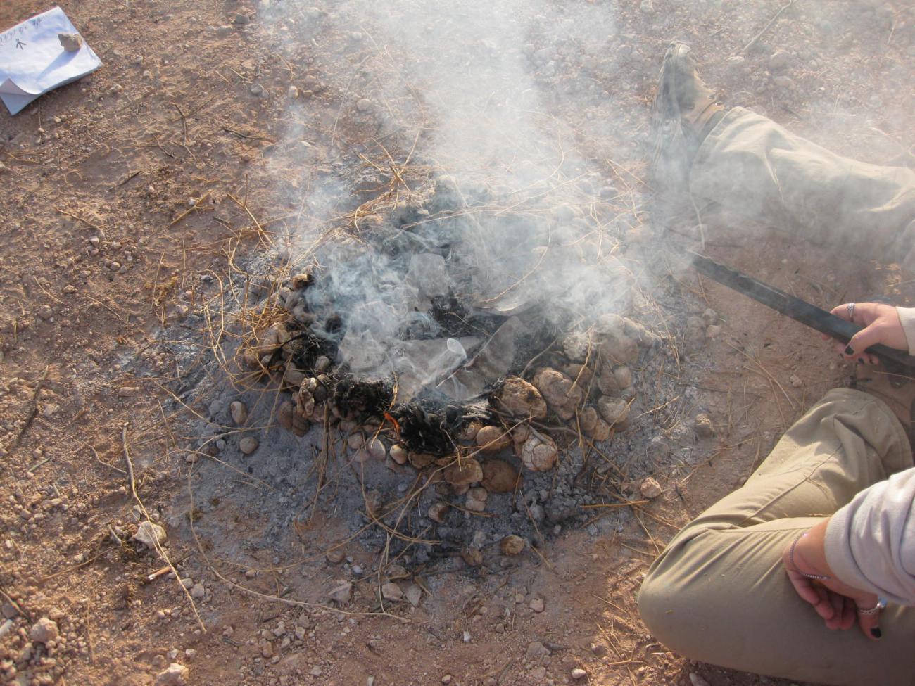 The primary question here is whether camel dung fuel, a previously unstudied waste product for this purpose, can achieve temperatures to harden clay vessels in a bonfiring setting. Once we achieved successful firings with only camel dung fuel we explored the effect of adding small amounts of sheep dung in some firings. This step was included because sheep dung was available as fuel in antiquity and we has an opportunity to discuss details of sheep dung with Bedouin ladies.