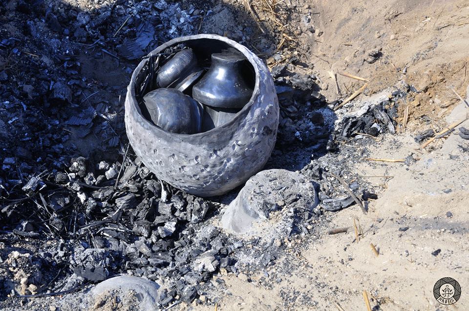 The first pit firing took about 6 hours, and at the end of the firing we buried vessels with small and fresh birch branches, leaves and then covering all of this with dirt. “Black reduction” showed up only on a few of fired vessels. Most of the ceramics became grey. We decided to lengthen the duration of firing by about 2 hours, and at the end, added some tarry wood such as pine or spruce. In addition, we placed smaller pots inside the bigger storage vessels. As a result, the small pots inside the bigger ones turned black and those that were left outside turned dark grey. The subsequent firings were carried out in a kiln, with the first taking about 8-9 hours. At the end we added some pine wood and closed the kiln. When the kiln cooled down and we opened it, we observed a small crack in the wall of the dome1 .