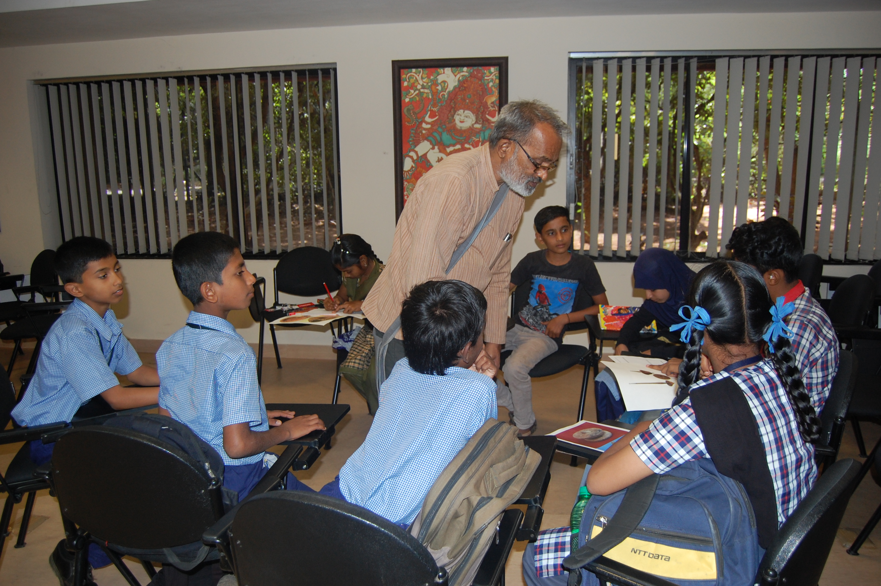 The workshop was envisaged to focus on students from government funded (three) and government aided schools (one); a total of four schools were selected, located within the neighborhood of NIAS where the workshop was held. In three of the schools, the medium of instruction was the regional language, Kannada, and in one it was English. The workshop was conducted for 45 students, who were divided into five groups which were divided randomly so that they would be mixed both in terms of gender but also each group would include students from different schools. The idea was that this would help the students from different schools interact, with each group being lead by one resource person. Resource persons belonged either to NIAS or BGVS, and some of them were experienced teachers (over 20 years' experience teaching various subjects in schools in Karnataka) from outside Bangalore. One teacher from each school was invited to observe the workshop, but was asked not to participate since they tended to get anxious over the performance of the children. The teachers who attended the workshop taught social science and science.