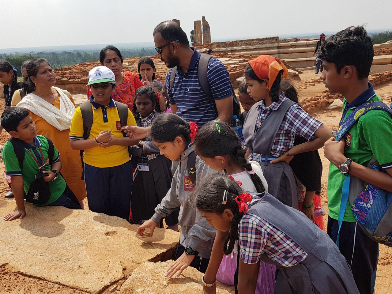On the second day the students were taken on a tour of an archaeological site, and met an archaeologist who had excavated at the site (See Figure 3). This site was that of a Jain monastery which had recently been excavated by the Archaeological Survey of India, who were very supportive and deputed one of the excavators at the site to talk to the students. During this visit, children were given an introduction to the site. An interactive session proceeded whereby they asked the excavator various questions. He also spoke to them about the importance of context to archaeologists, and why removing artifacts from sites is problematic. The workshop was planned to facilitate interaction between children of different schools; however, we found that language played a major role in how children interacted with each other and with the resource persons. Children from the government-aided school were largely English speaking and tended to be more confident, to the point where they admonished children from other schools for incorrect answers. At the same time, their answers also tended to reference strongly to the history they had learnt in school classrooms or textbooks.