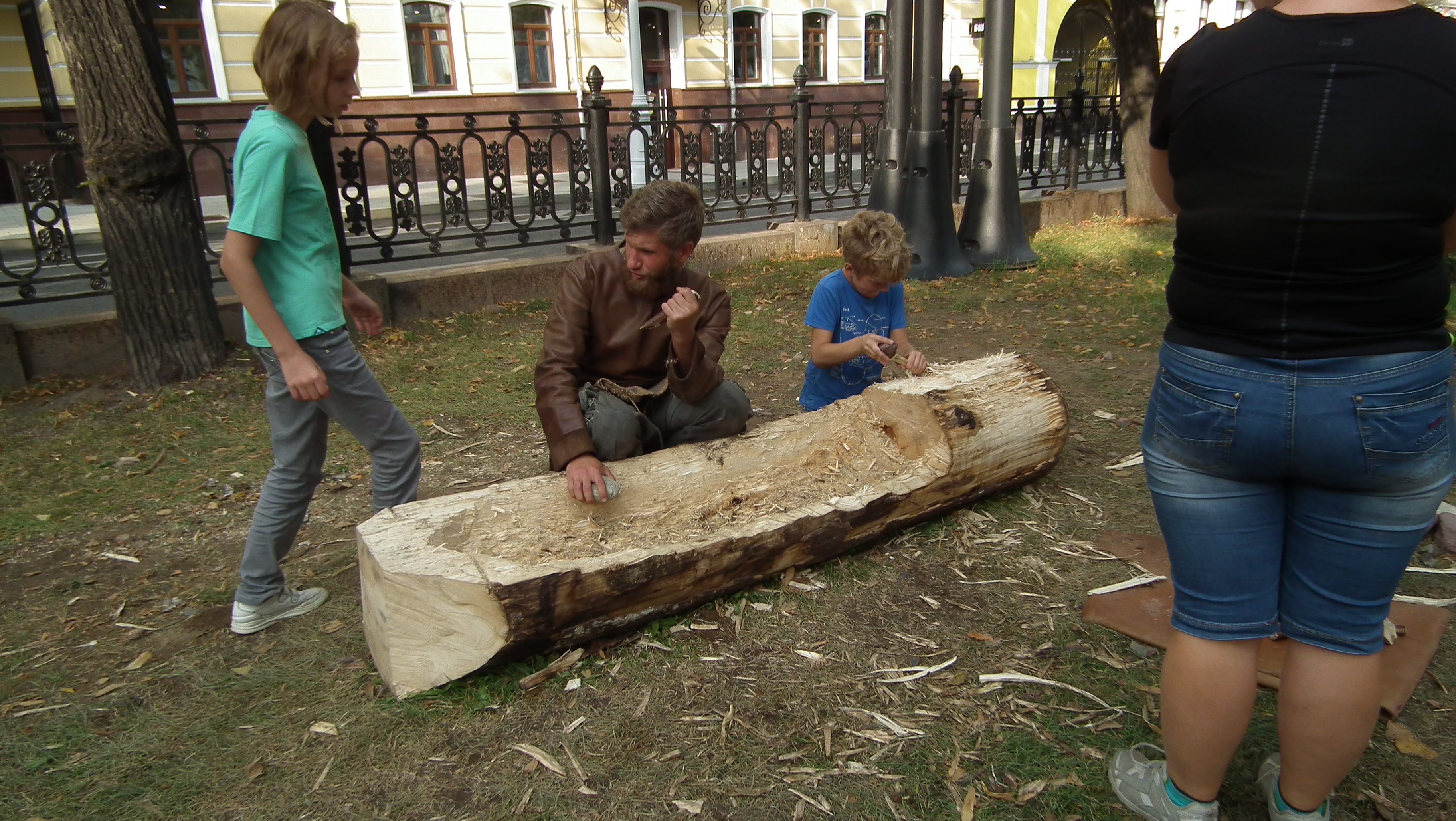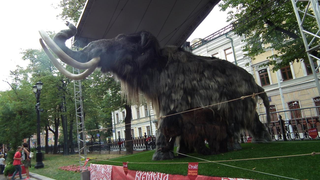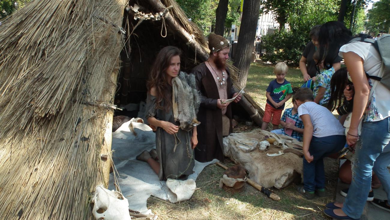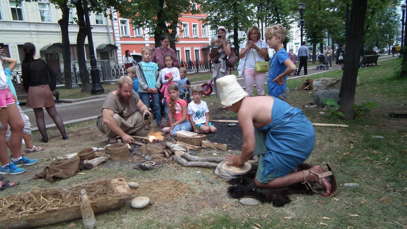 The Dawn of Humanity was presented on Petrovsky Boulevard as a joint venture between EXARC and Times and Epochs, and organised by Ivan Semyan with the help of local reenactors. This was the first time that prehistory was represented at the festival, and the exhibits were impressive, including a life-size mammoth and a woolly rhino on loan from the Palaeontology Museum. In addition, a pop-up museum displayed ancient tools and objects with EXARC members and local reenactors recreating the crafts and activities of prehistory. Informative signboards lined Petrovsky Boulevard, explaining the different periods that were represented. Visitors posed for photographs with reenactors and had the opportunity to participate in some of the ancient crafts. Carving a log boat using a stone maul with an antler chisel was a popular activity, as was making flutes from Japanese knotweed canes. Visitors also got a taste of prehistoric cooking with samples of Mesolithic stewed pears.