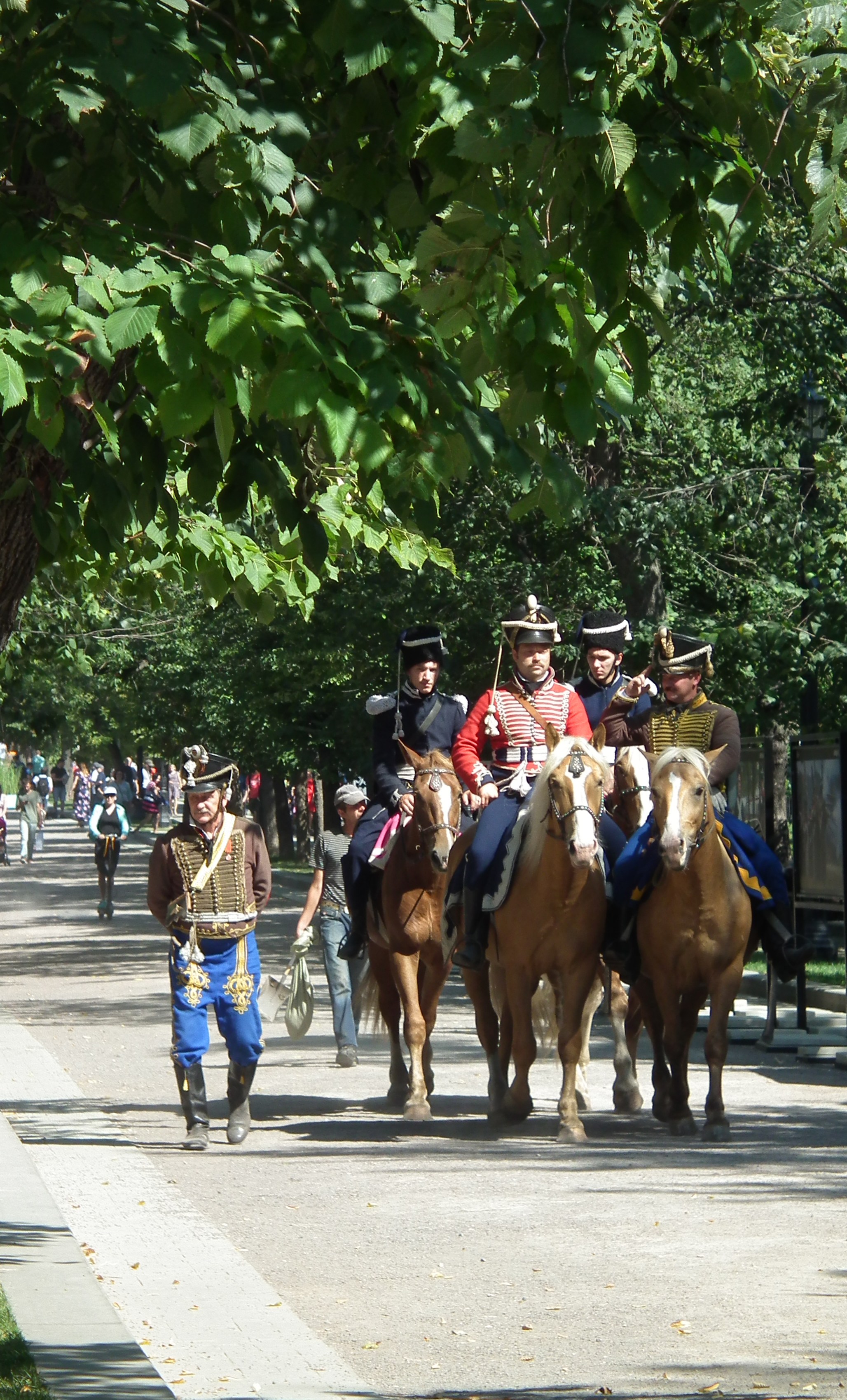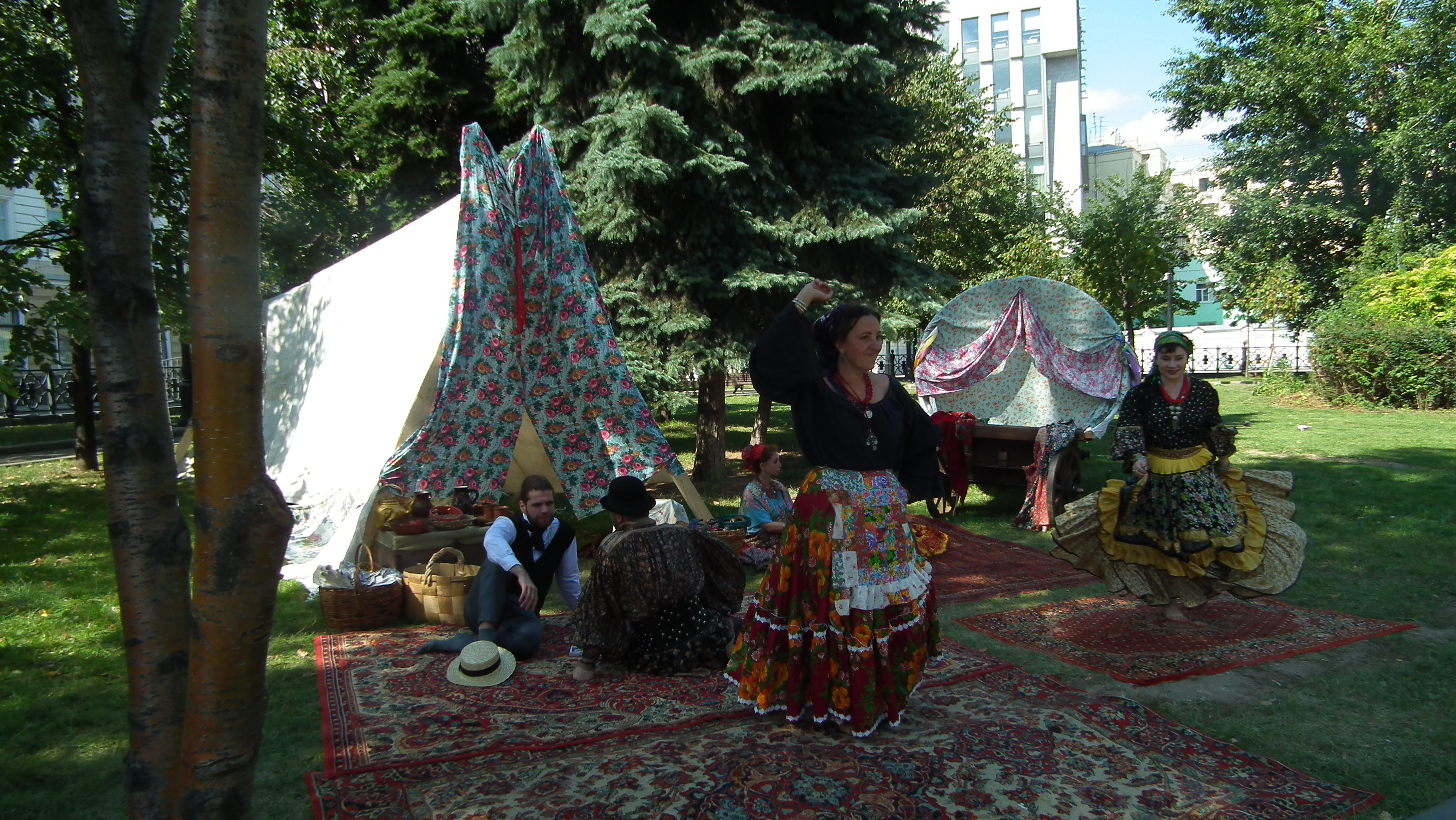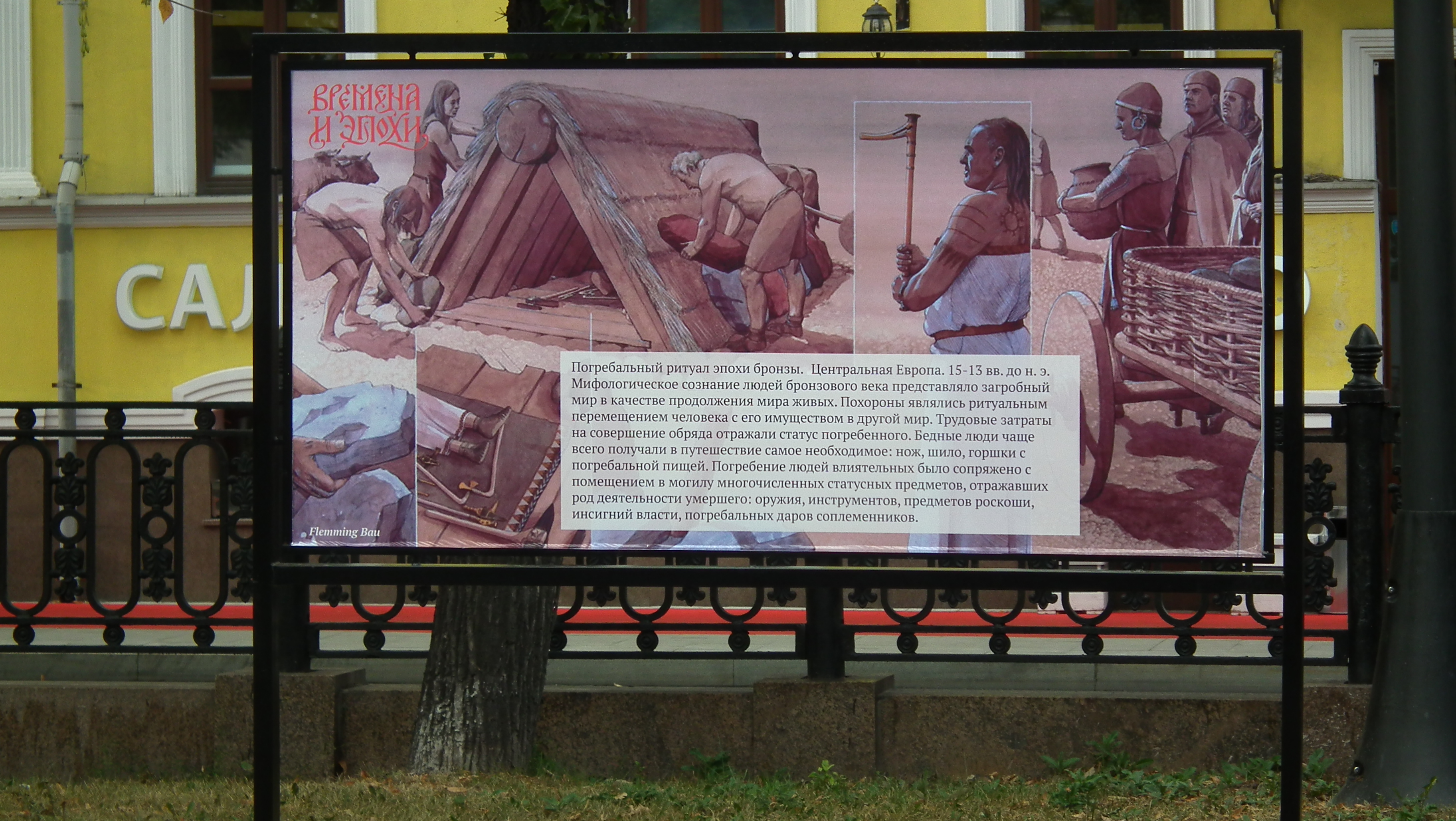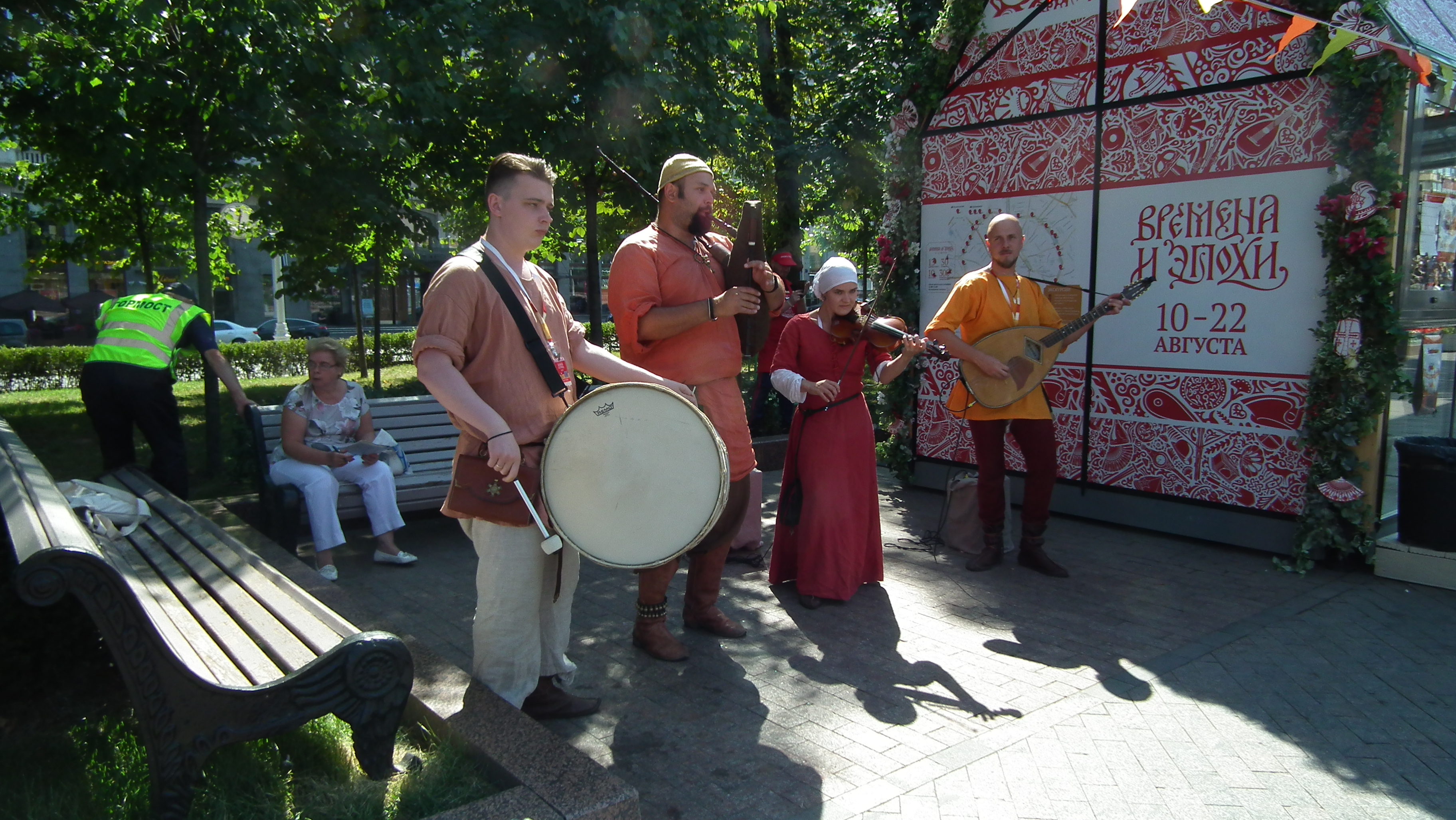The Dawn of Humanity was presented on Petrovsky Boulevard as a joint venture between EXARC and Times and Epochs, and organised by Ivan Semyan with the help of local reenactors. This was the first time that prehistory was represented at the festival, and the exhibits were impressive, including a life-size mammoth and a woolly rhino on loan from the Palaeontology Museum. In addition, a pop-up museum displayed ancient tools and objects with EXARC members and local reenactors recreating the crafts and activities of prehistory. Informative signboards lined Petrovsky Boulevard, explaining the different periods that were represented. Visitors posed for photographs with reenactors and had the opportunity to participate in some of the ancient crafts. Carving a log boat using a stone maul with an antler chisel was a popular activity, as was making flutes from Japanese knotweed canes. Visitors also got a taste of prehistoric cooking with samples of Mesolithic stewed pears.