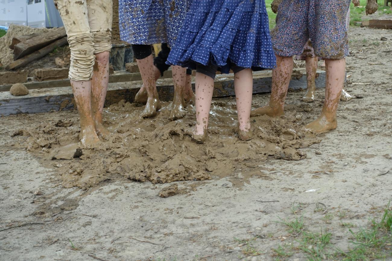 Moving from the landscape to the reconstructed houses, there are a number of issues with strong contemporary relevance. One link lies between biodiversity and buildings made from clay, wood and thatch, for example, they are yet another habitat for many species. Wild bees, a particularly endangered group of insects, find shelter among the thatched roofs and in the clay walls. However, past building techniques and materials can also function as a bridge to socially relevant questions of the present and future in other ways. More specifically, when looking at sustainable and environmentally friendly ways of building, wood and clay are celebrating a renaissance (Knoll und Klamm, 2015, p.191). To further enhance debates on alternative building techniques, we organize each year an event titled ‘Clay, cob and wood in past and present’. We work together with a range of partners and societies, carrying on with repairs on our historic reconstruction (in front) of the museum, with the help of the visitors and showcasing the use of such material in the present. For children, this is always a great day out, as they can “muck in” and get dirty (See Figure 8).