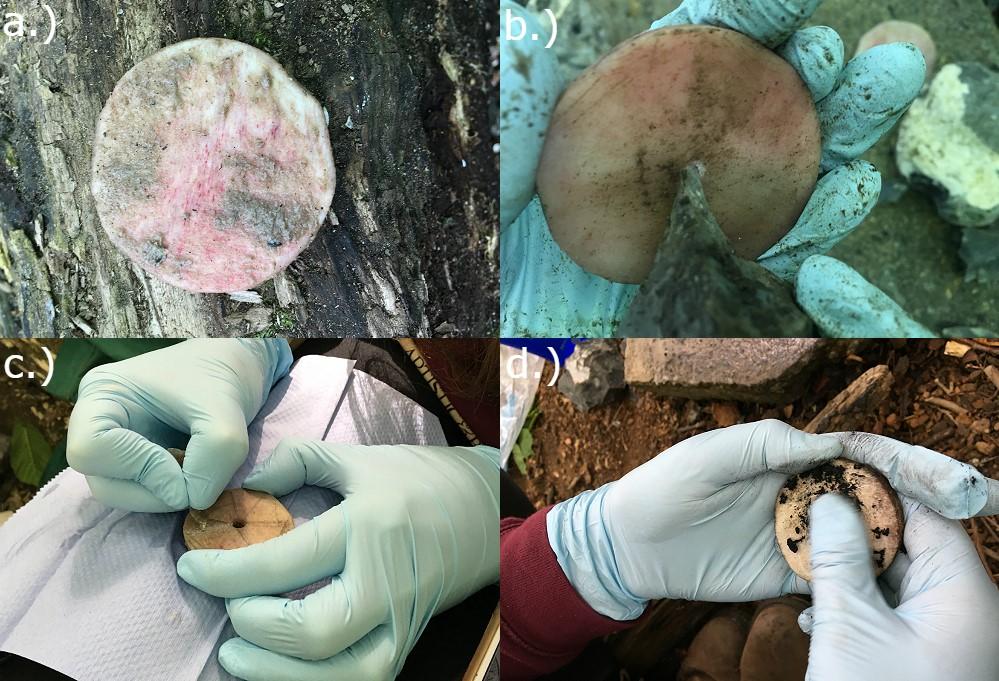 Following MÄrtensson et al., (2006) experimental observation that spindle whorls can be effective at spinning yarn at weights as low as 4-18 g, bespoke rondelles were manufactured weighing 14 g each to facilitate their testing as spindle whorls. To test the ability of the rondelles to spin textiles, three fibres were chosen: dog (Canis familiaris) fur (5 g), sheep (Ovis aries) wool (5 g) and natural roving (pre-spun wool) (2 g). A 100 mm section of horse chestnut wood was carved to fit the central perforation and a 5 mm notch was added to the top to act as a hook to catch the fibres. Two experiments were conducted, one rondelle spinning roving and dog fur and the second roving and sheep wool. The wool and fur were separated into strands and any dirt removed beforehand. The fibres were then drafted into strands and the spindles dropped to spin the yarn; if after five attempts there was no success then the experiment was ended (See Figure 11a-d).