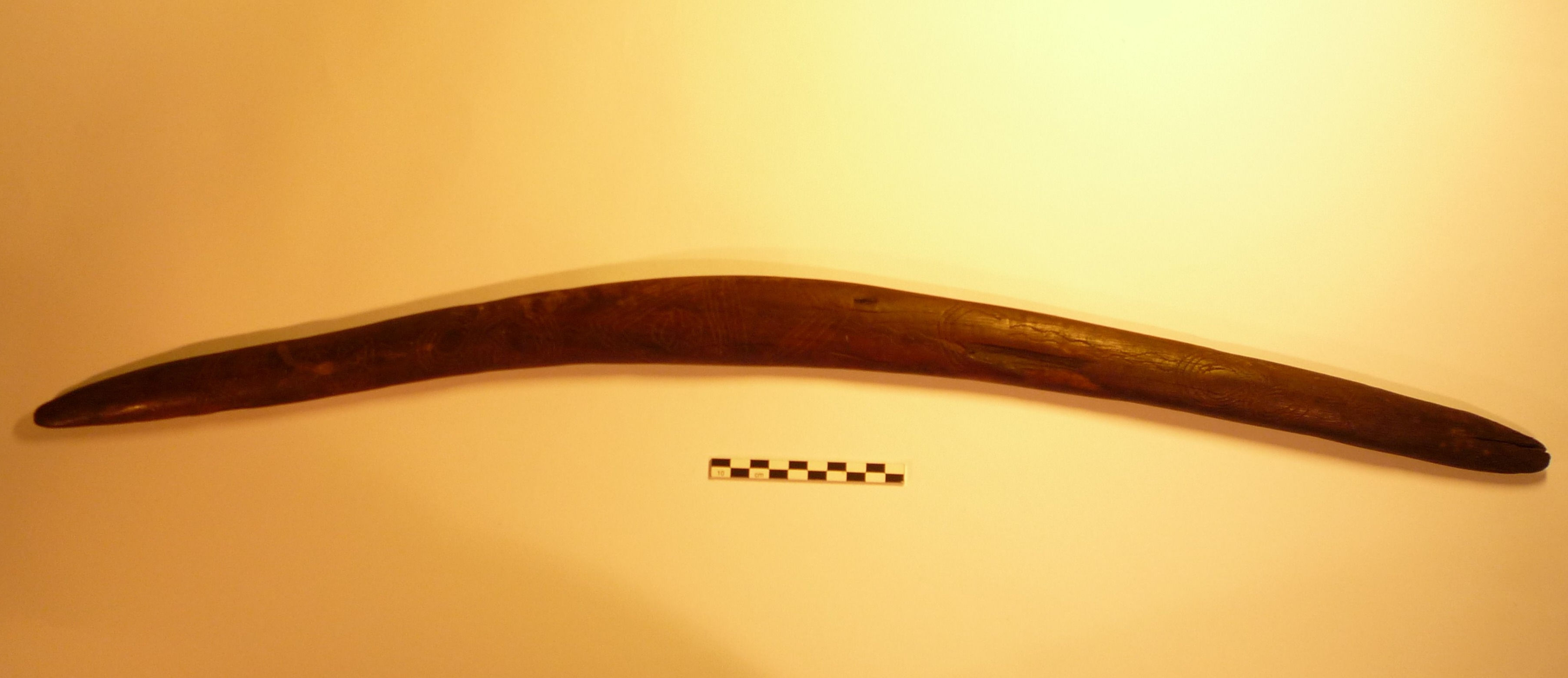| Figure 13. Archaic throwing stick (1123). This "archaic" type of throwing stick with a low curvature and elliptical airfoil section comes from Western Australia, collected at the beginning of the 20th century. It is covered with engraving on both sides: concentric circles, corrugated lines on extrados. A snake on the underside. |