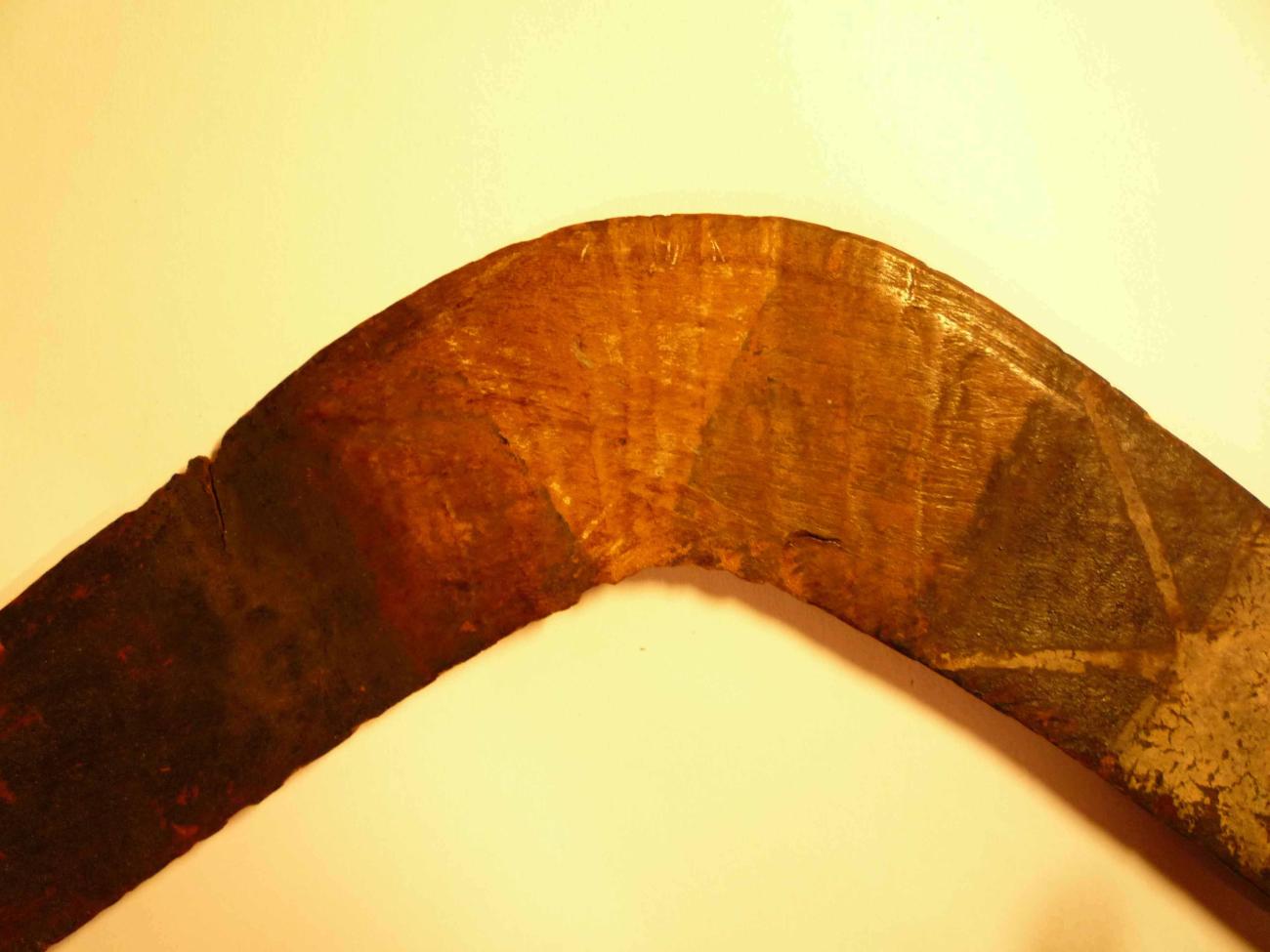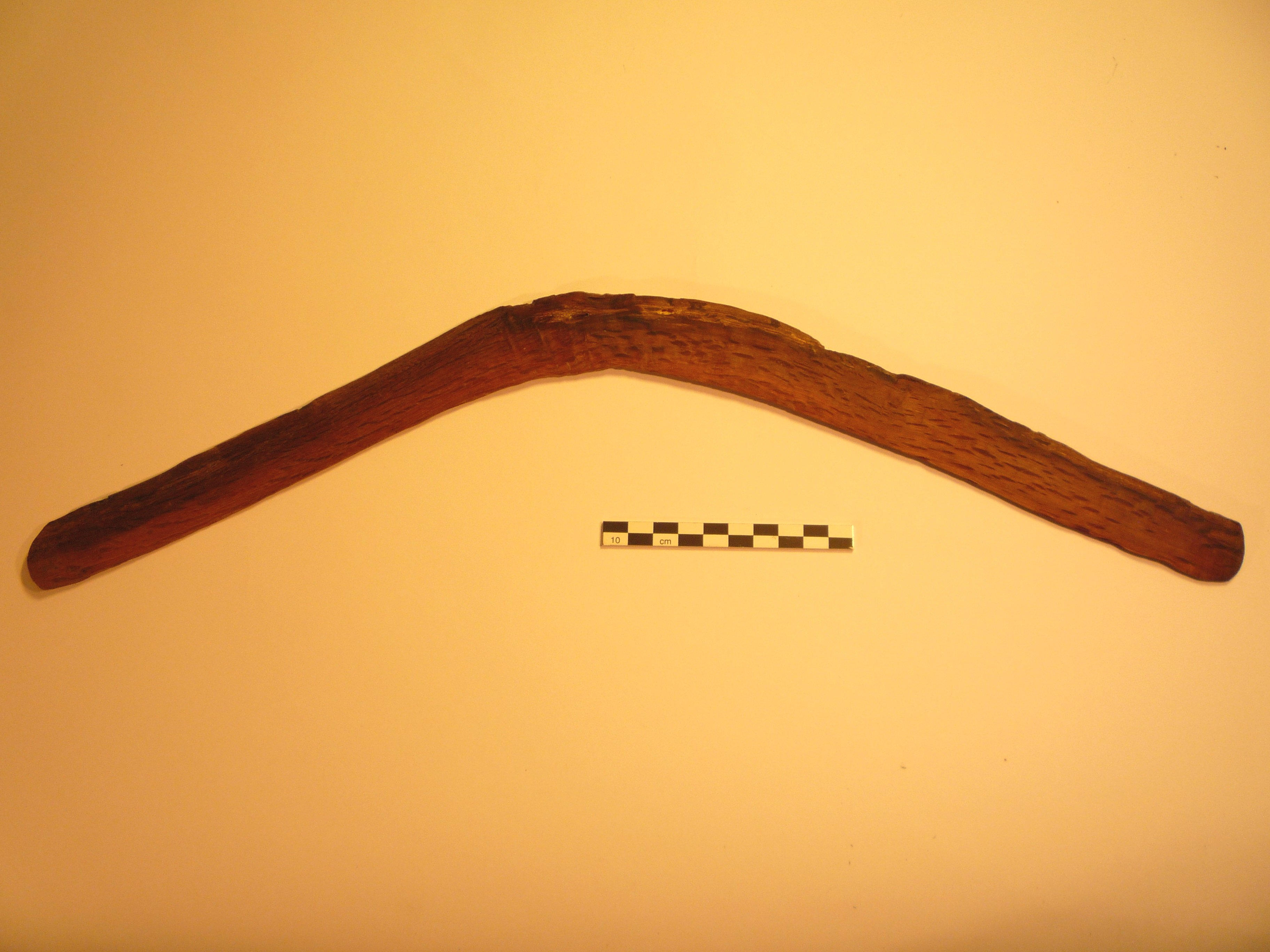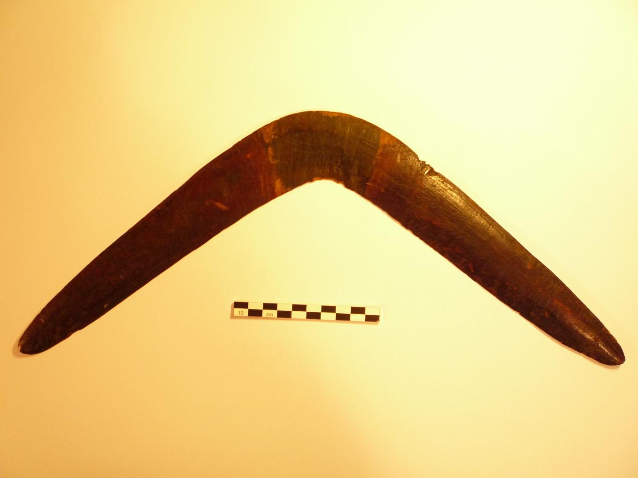 | Figure 12. Central desert grooved throwing Stick of the Early 20th Century (1017). This asymmetrical, grooved throwing stick with broadened short blade is typical of the Australian central desert region, collected at the beginning of the 20th century. According to ethnological information on the manufacture of these throwing sticks, they were frequently built on diameter halves after splitting to form pairs (Jones, 1996). |