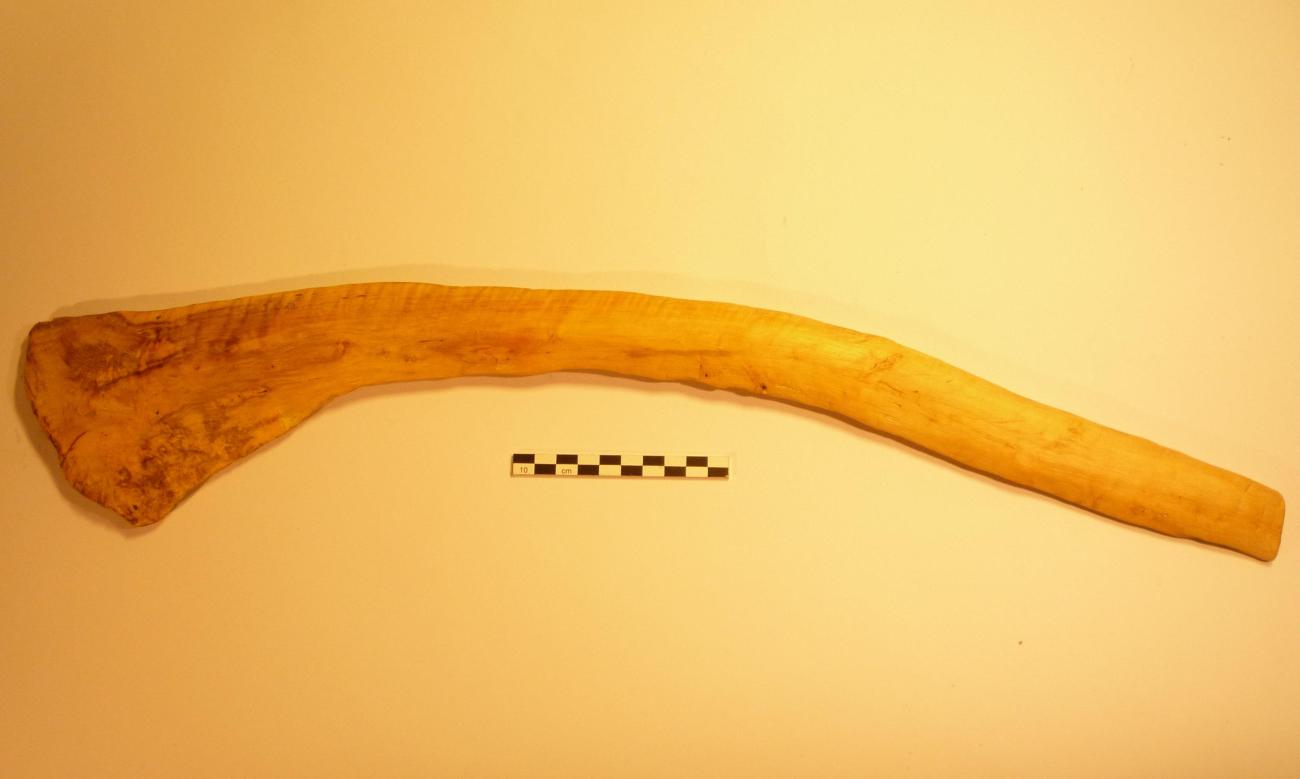 | Figure 8. Replica of a perforated Tun throwing stick, hornbeam wood (Carpinus betulus) (bl43). First replica of an African throwing stick from Chad cut with a machete in one half branch of hornbeam tree, split with a metal axe. Their profile is rectangular and small in front of the original diameter of 7-9 cm. Internal face of the wood corresponding to the intrados. |