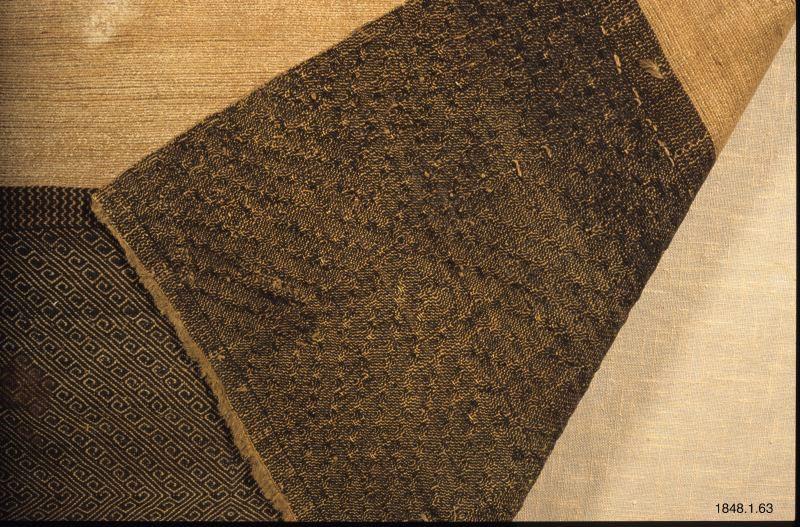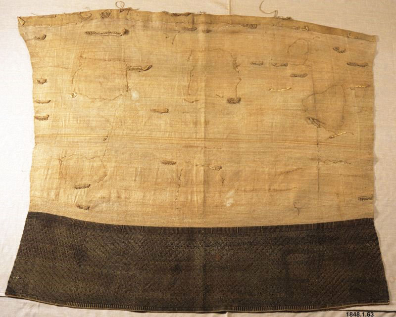 The Stockholm cloak, mantel 1848.01.64 (See Figure 1) was collected during Captain James Cook’s first visit to Aotearoa in 1769-1770 and is held as part of the Joseph Banks Collection in the Ethnographical Museum of Sweden. The kaupapa (body of the cloak) is woven from muka (also known as whitau) which is the inner fibre of the harakeke leaf (Phormium tenax), in a compact weave with aho poka (inserted short rows for shaping). There is debate as to whether this weave is aho pātahi (single-pair twining) (Mead, 1969), aho rua (double-pair twining) (Porter, 1977) or counter-pair twining (Blackman, 1998). The excellent photographs taken by Blackman, and those provided online by the Stockholm Museum suggest to me the technique may be counter-pair twining, that is, alternating rows of Z and S twist. There are remnants of widely spaced dogskin and feather tassels attachments, and a wide hem tāniko border with a unique, complex linear design (Mead, 1969) (See Figure 2).