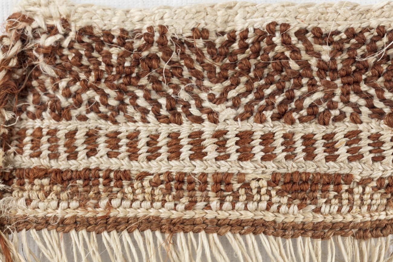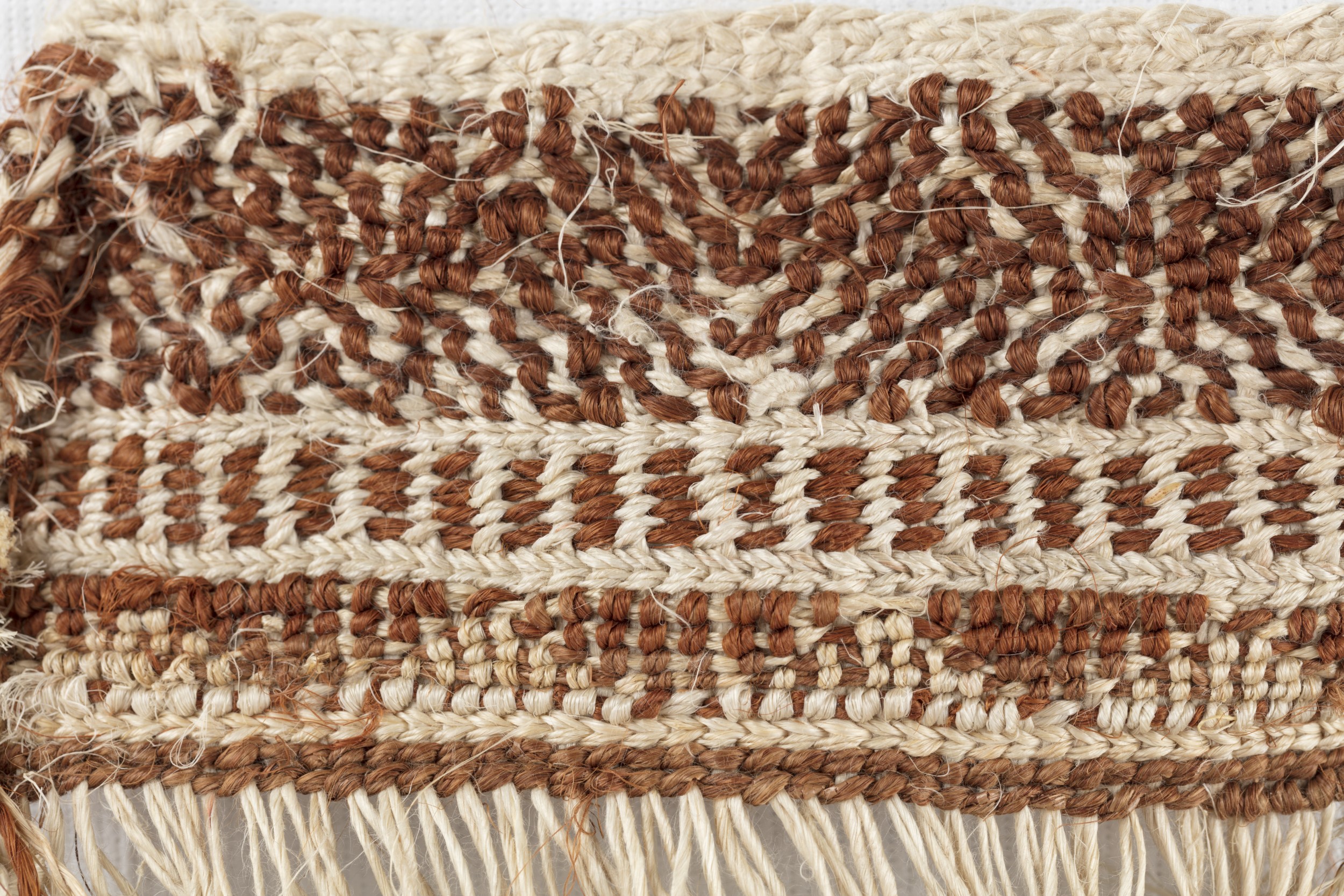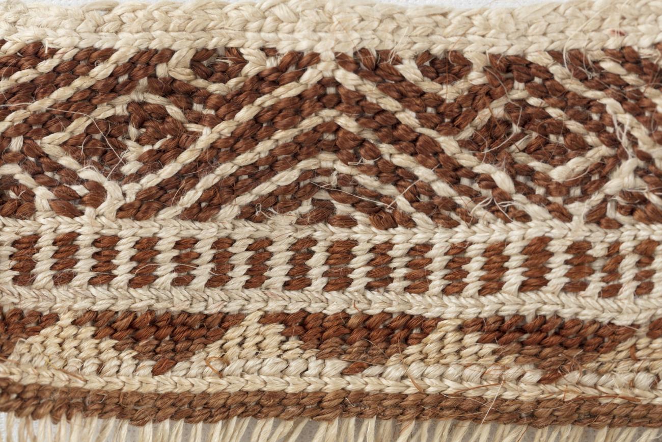 Aho rua (double-pair twining) is the customary technique to set up the warp threads, and a selvedge edge was created by folding each thread in half, twining, adding in another thread and folding the first back into the next stitch, and repeat for the desired width. The initial Tauira Tāniko 1 has 2.5 mm whenu and 3 mm aho, and Tauira Tāniko 2 has 1 mm whenu and 1.5 mm aho. The first row of weaving, te aho tapu, is important to get correct as it is from here the rest of the pattern flows (Te Kanawa, 1992). One brown and one white thread were used in the first attempt, with an undyed passive aho. Very quickly on this first row, I realised that to achieve the opposing diagonal lines, I would need to change my technique of solely using a Z twist and use both the Z and S twist within a single row. This counter-pair twining within a row is rare, presently only confirmed on five 18th Century cloaks held in overseas museums (Blackman, 1998, p. 79). This gave the correct appearance on the front; however, the pattern was uneven with poor tension, partly due to the wide threads, and partly inexperience of the weaver. In addition, and more importantly, the back was very different from the Stockholm structure. Therefore, the Tauira Tāniko 2 was woven in the same technique, with a brown and a white thread, but without a passive aho. Finally, the back reflected the Stockholm tāniko border (See Figures 7 and 8).