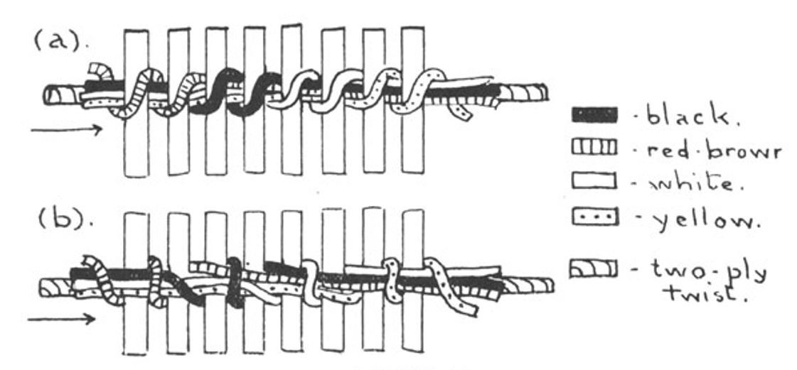 Tāniko has a similar structure to wrapped twining, commonly used with strips of plant material for basketry or net making (see Adovasio, 2010, p. 19; Fig.11a for a schematic of wrapped twining, and Buck, 1925, pp. 61-92 for the development of tāniko). The active weft element twists up over the front of the warp thread and around the passive threads at the back, then through to the front again (See Figure 3). The thread may be twisted in a clockwise, S-twist direction or in an anti-clockwise, Z-twist direction (Blackman, 1998). In addition, a two-ply Z-twist undyed muka thread is carried behind the warp as a passive element to stiffen the fabric and to prevent kinking by pulling to keep the tension even and tight. An expert creates a fabric where all passive threads are covered by the active weft (Buck, 1926). The patterns are made using five components
