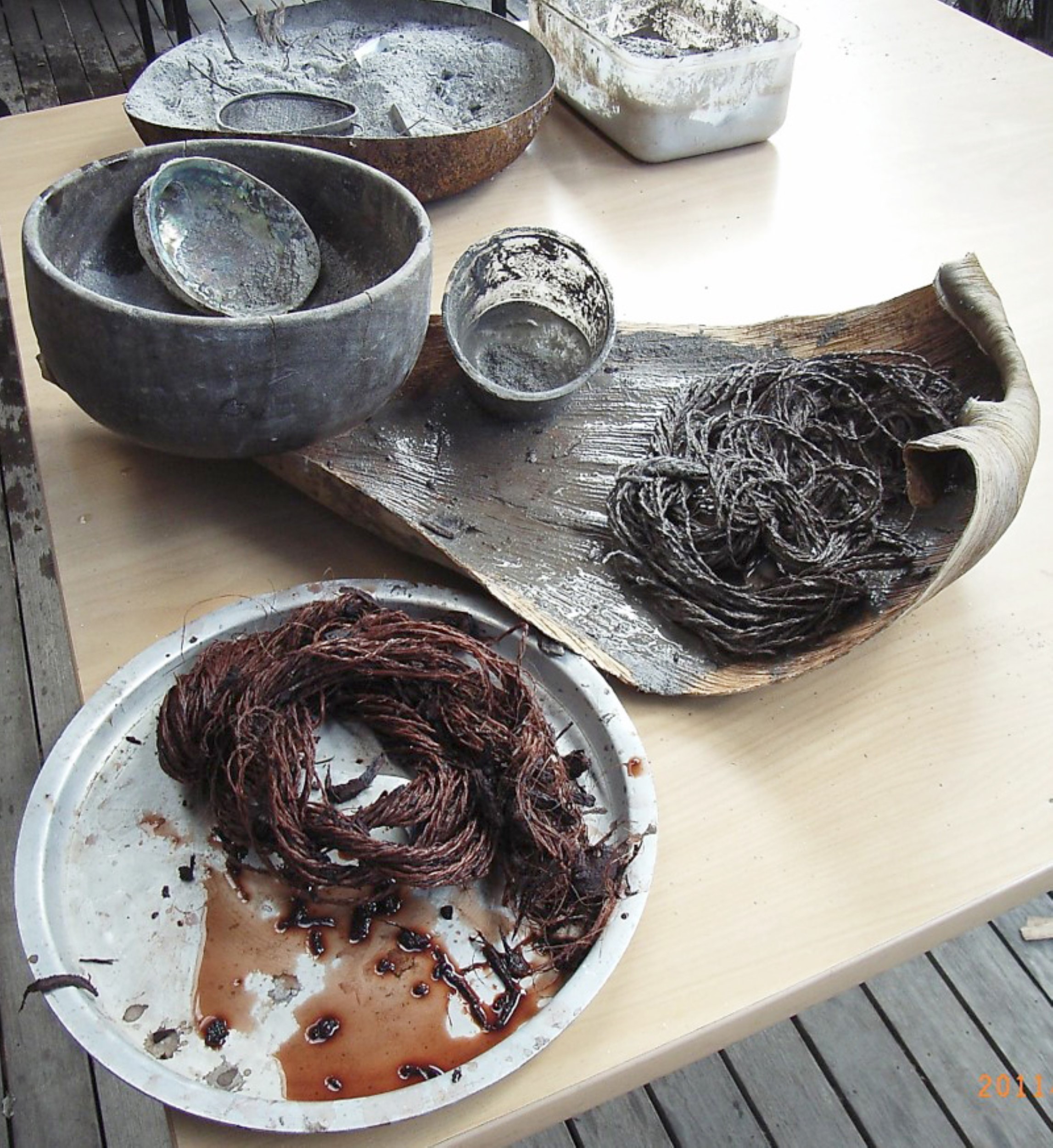 The aho were dyed red/brown with the bark from the tanekaha (Phyllocladus trichomanoides) tree. One handful of crushed bark was placed into 500 litres of boiling water and left for at one hour before the muka cords were added for 30 mins. In the past the bark was boiled in a kumete (wooden bowl) with heated stones used to boil the water. One cup of wood ash was mixed to a paste with warm water and the cords immersed for 20 minutes until the colour fixed (See Figure 6). The type of ash used affects the colour, with tōtara my favourite as the aho turn a deep red-brown, however, a mix of wood ash was used for this project.