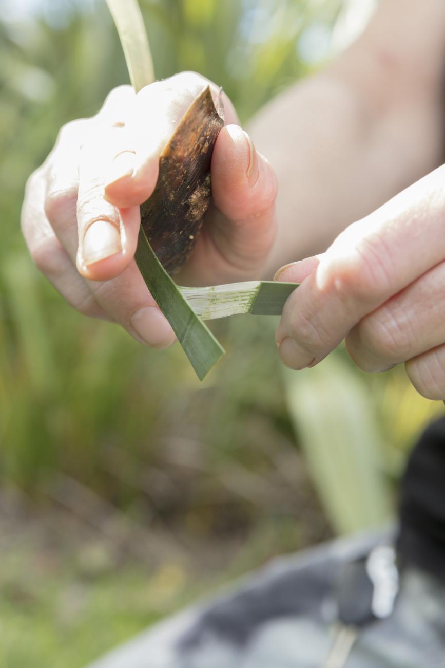 The centrality of harakeke is reflected in the kawa and tikanga (Māori protocols) of the planting, harvesting, preparing and processing harakeke, and in the weaving systems. There are strict kawa for harvesting harakeke which keep the plant and weaver safe; the central shoots of the harakeke represent the whanau (family) and must not be cut. These are referred to as the rito (growth) and awhi rito (to help grow), or the pepe (baby) and mātua (parents). In addition, harakeke must be cut during the day; it cannot be cut if it is raining or the weaver is menstruating. The leaves were cut with a mākoi (mussel shell, Perna canaliculus) which had been sharpened against a hoanga (grindstone, sandstone). The mākoi proved effective though it needed re-sharpening after cutting ten leaves. As “the finished product is dependent on the preparation of materials” (Te Kanawa, 2008, p. 147), great care is taken during the next stage.