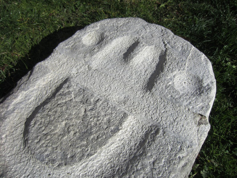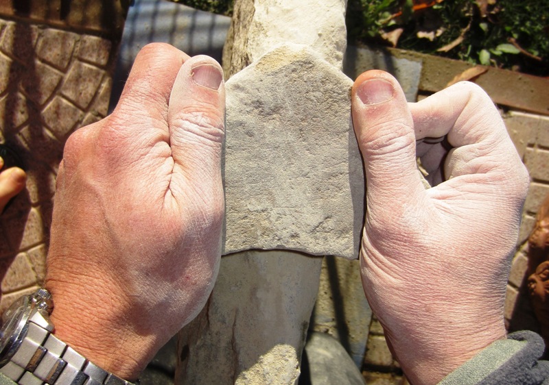 Once the bas-relief parts were put on display, I continued to remove the surface by alternating scraping with jasper and hammering with the pebble. Hammering the sandstone divided it into sand and quartz, and then the scraping became easier to make a new smooth surface. This was hammered again and then polished many times. Many times, I had to wash away the sand from the stone. I used a round stone weighing 1400 grams and 10 cm in diameter as a hammer. Without a handle I could control the work better. To smooth the sides, it was not possible to hammer because I hit the sedimentation planes perpendicularly without ever having a smooth surface.