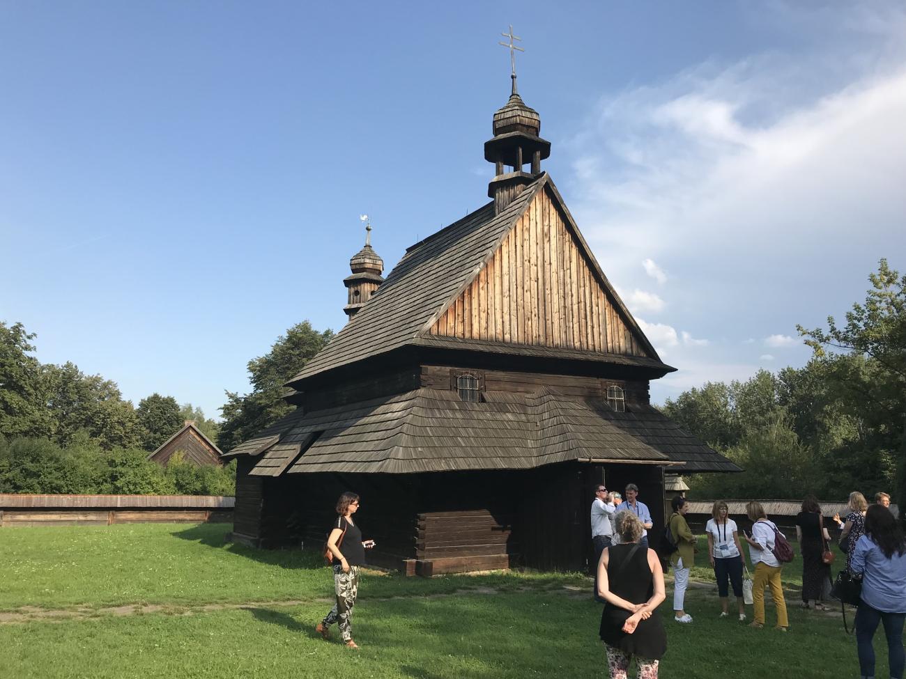 Day one began with a visit to the Silesian Museum in Katowice, followed by a visit to the Upper Silesian Ethnographic Park in Chorzów. Arriving in Poland we travelled directly to Katowice to meet up and head to the first location of the conference in Chorzów. The former coal-mining site at Katowice has been transformed into an industrial museum and art gallery focusing on the Silesian region. Maximum use has been made of the space by installing the galleries underground with low impact on the surface. Unfortunately, the industrial part of the museum was closed when we arrived. However, we had access to the galleries, providing us with an impressive introduction to polish museums (See Figure 1). After an introduction and short tour of the Silesian Museum, we boarded the bus for our first visit to the Upper Silesian Ethnographic Park in Chorzów. The park is a welcoming green space, situated between the urban centers of Katowice and Chorzów. This ethnographic park is a traditional folk museum with sixty agricultural and rural buildings from all over Silesia. The buildings date from the 17th century to the 1940s, and include a granary from 1675, and Nieboczowy Church from 1791 (See Figure 2).