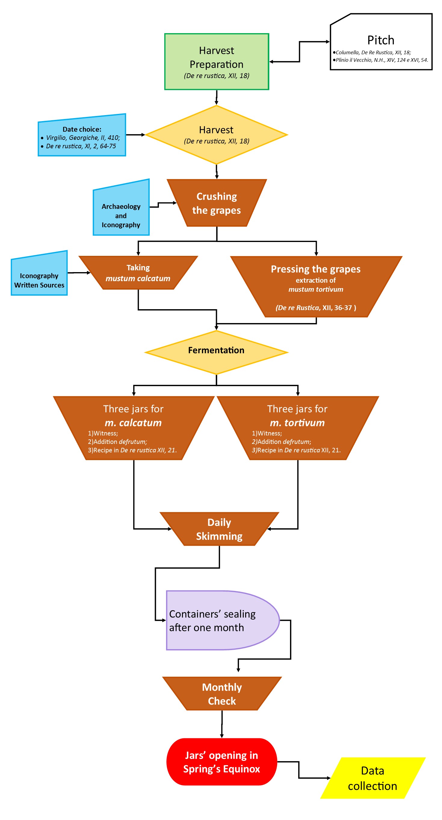 Harvest preparations are very well described by Columella (De Re Rustica, 12.18). He also describes the operations on the bunches (ibid., 12.18, 12.36-37) in particular the grape pulps pressing, while the crushing phase is known through iconographic representations. The entire phase of operations on the must was ethnographically recreated, by hypothesis, by comparing the same operations carried out by the peasants in the Sicilian countryside until the mid-20th century (Biundi, 1852).