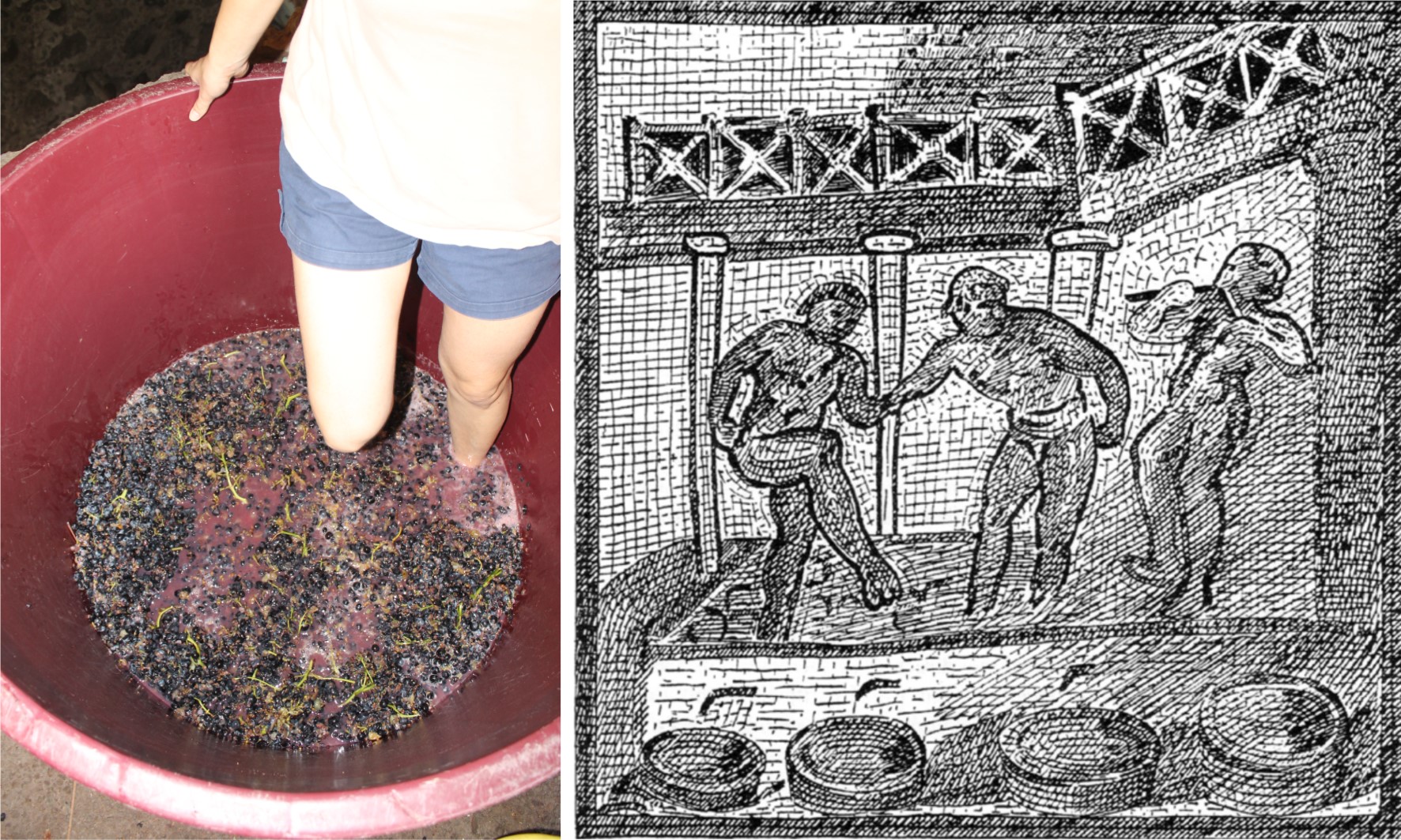 After the harvest, the crushing by foot (calcatio) began, according to what it was possible to reconstruct from the iconographic sources (See Figure 5). A total of about 50 litres of must were produced: of these, 25 litres of only mustum calcatum (exclusively extracted by crushing) were collected in the two previously set up small dolia.