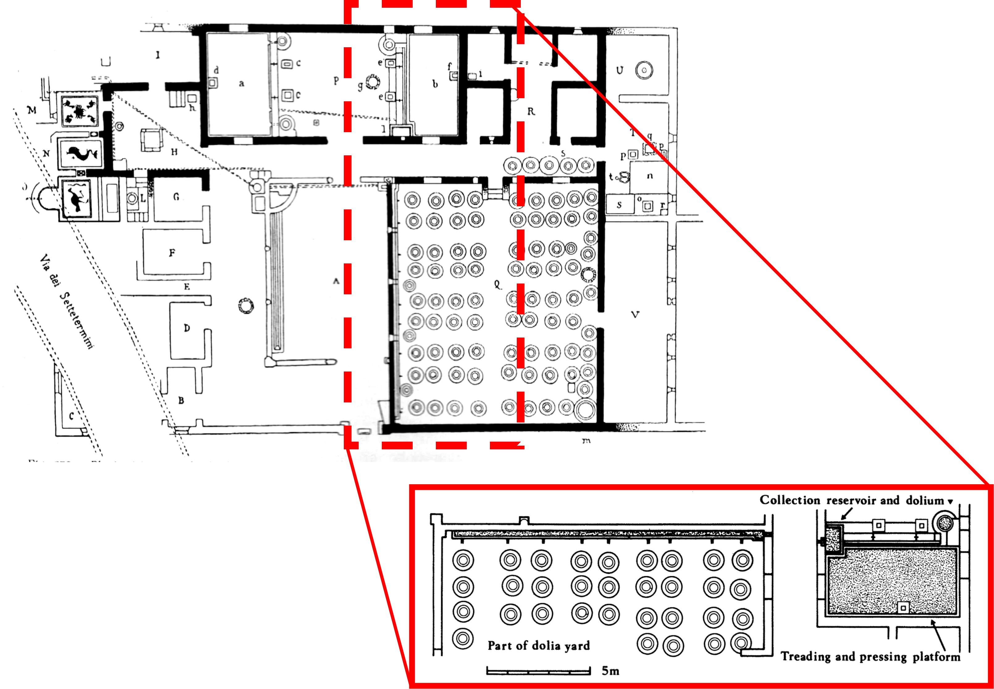 Proof of this comes from archeology, namely the Vesuvian area and, specifically, Villa della Pisanella (See Figure 7), discovered a few kilometers from Pompeii (Pasqui, 1897). There was a residential part and a part for productive activities including a wine press and a wine cell with eighty-four dolia defossa (underground vessels where the wine was stored). The villa, discovered in 1876, was inhabited from the first century BC until the Vesuvius eruption in 79 AD. It is the best example of a Roman villa rustica (devoted to agricultural activities) and it is the only one in which it was possible to recognize the crushing and pressing system, the must collection basin, the canalization system and the wine cellar with the dolia defossa. Its conformation suggests that crushing and pressing could take place in the same environment (calcatorium). The must produced flew into the lacus through a hole in the retaining wall, and from there it was sent, via an underground channel, to the wine cellar where the dolia were located (Rossiter, 1981, p. 348). This system is perfectly suitable to the above-described vinification “in white”.