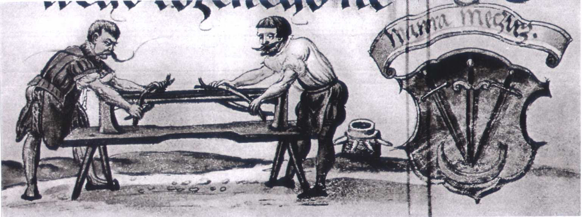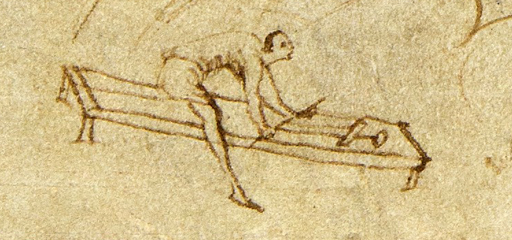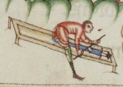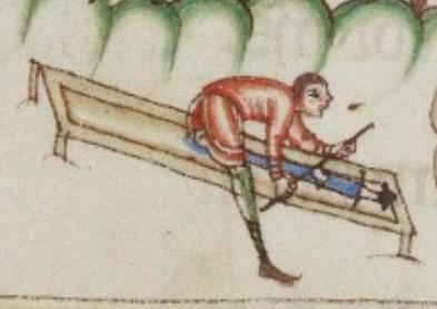 From the High Middle Ages onwards, the design of the polishing bench changed. In the Codex MS Bodley 264 of the Oxford Library there are two illustrations (See Figures 3 and 4, MS Bodley, 264, 1300, fol. 49r and 113v) of polishing benches, which are used by two craftsmen each. Here an additional raised working platform is mounted on the low polishing bench. This changes the tool from a simple stick to a clamp like tool consisting of a stick and possibly a belt. The new design allows the tool to be guided better and to be more stable. But the strange hand position is still the same. While at the polishing bench on fol. 49r the left figure has a whetstone/steel fastened in the tool, the two craftspersons on fol. 113v, have dark objects between the tool and the surface of the sword, possibly leather or textile rags.