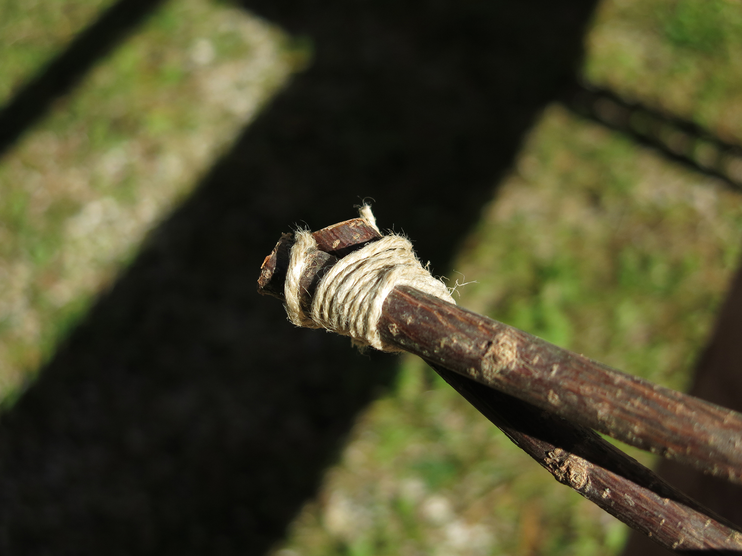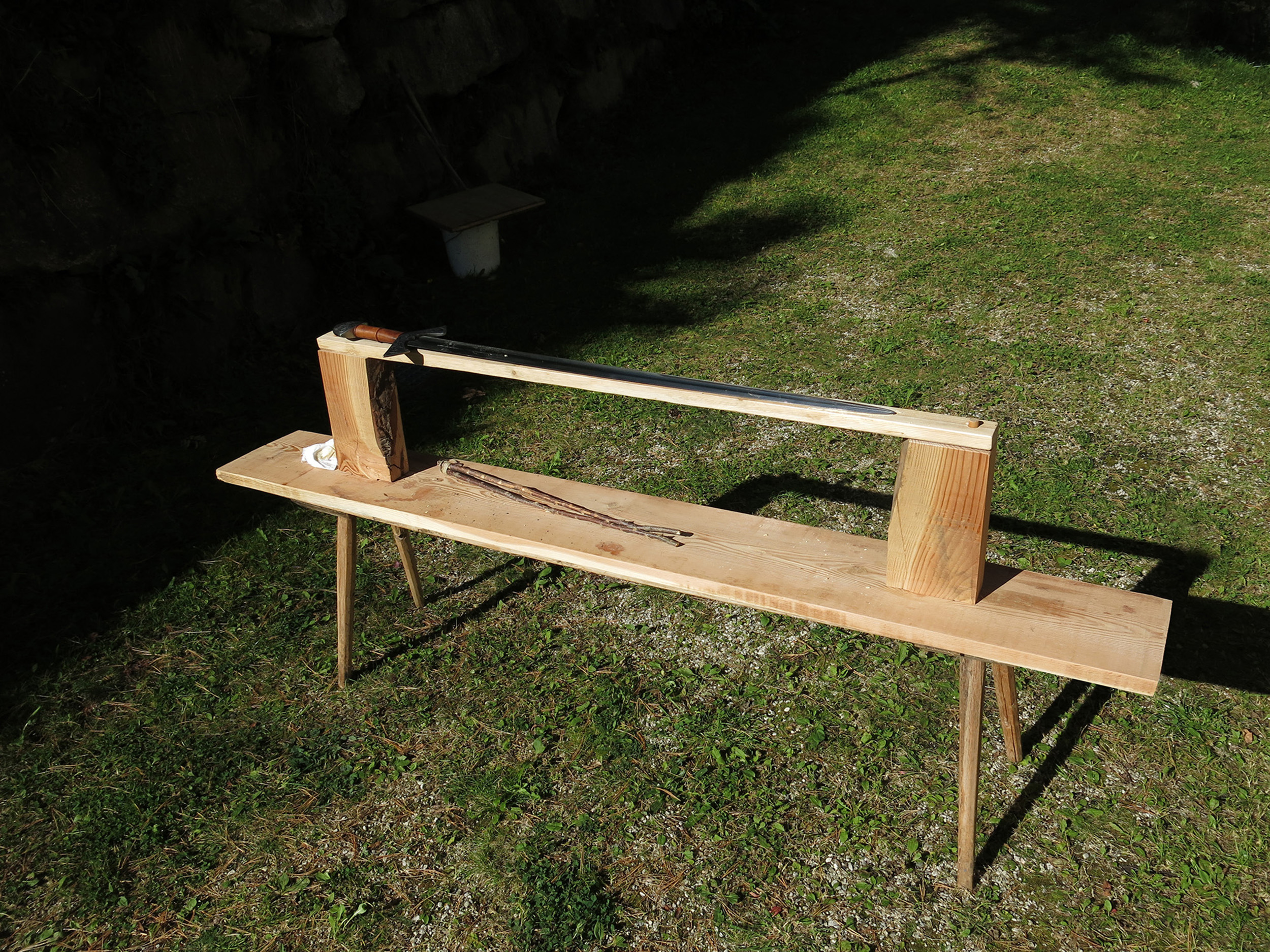 During my experiments, in order to prevent the sword from slipping without a helper, it had to be attached on the handle with a cord to the polishing bench. A wooden clasp at the tip provided additional stability.