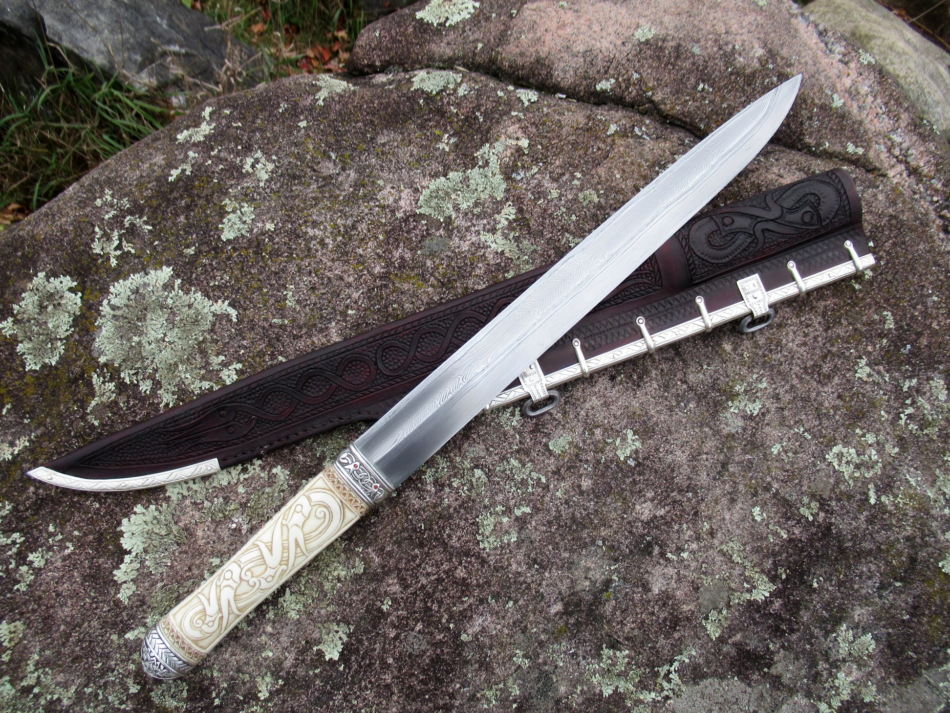 It is a "Langer Schmalsax" (length of the blade 35 cm, width 3.5 cm), with elaborate decoration in animal style from Scandinavia, made by Jeff Helmes from Canada (See Figure 14). The swordsmith refined the metal for the blade himself, so that it comes close to an original. Characteristic are the clearly visible foldings of the iron in the area near the cutting edge. With this process of the repeated folding the iron was cleaned from slag and other impurities. The heart of the blade is the characteristic pattern welding in the area of the fuller, which consists of two twisted steel rods with different carbon contents.