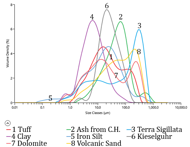 Thanks to Jasper Moernaut of the Institute of Geology at the University of Innsbruck it was possible to analyse the grain size of the agents. For the research a Malven Mastersizer 3000, a laser diffraction particle size analyser (dispersion with ultrasound for 30 seconds with a frequency of 30%) was used. The “Dx (90)” parameter means that 90% of the total volume of material in the sample is contained and is a standard value.