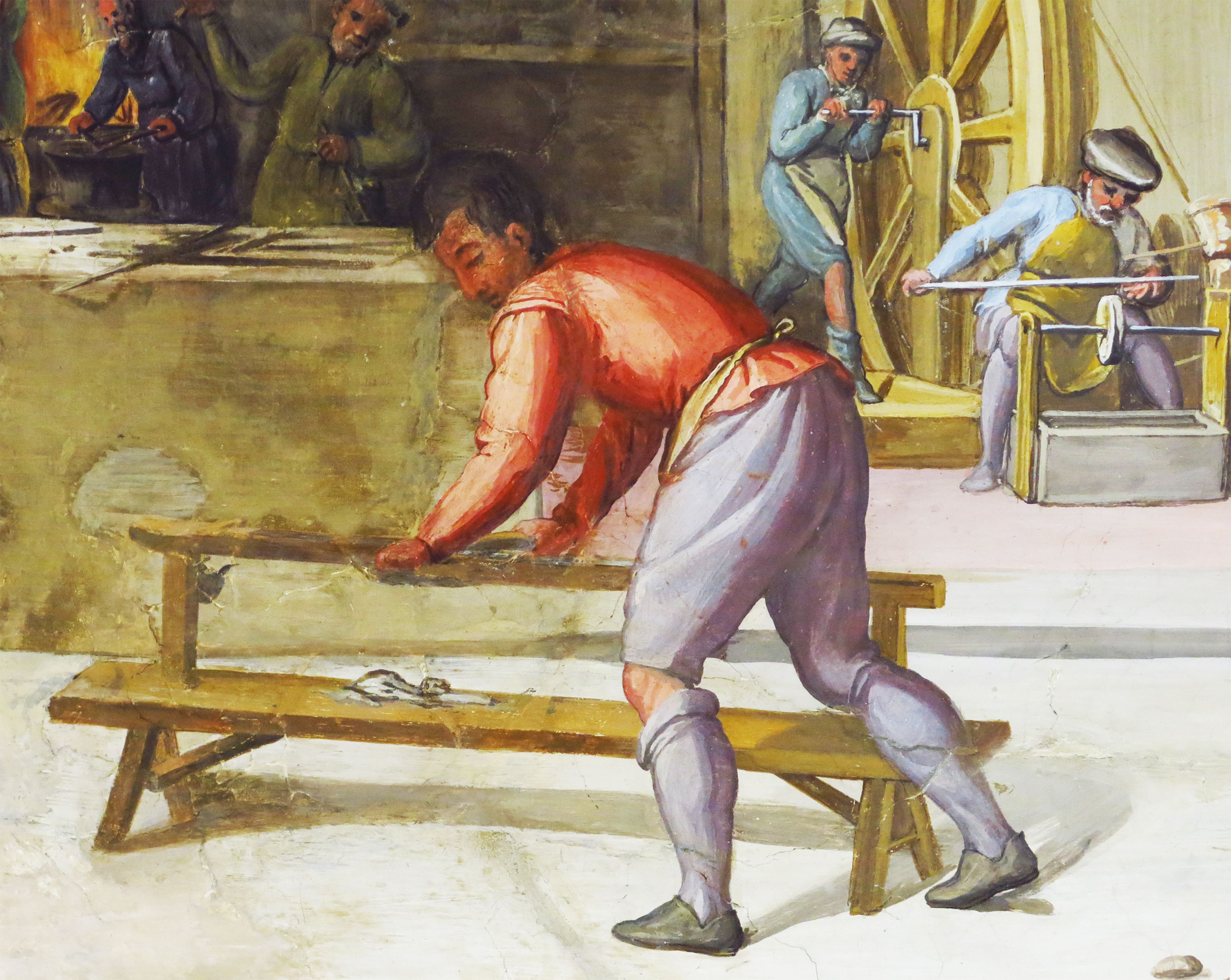 Very detailed depictions of early modern age polishing benches can still be found on a ceiling fresco in the Uffizi in Florence (See Figure 5) and on a songbook page from Brod in Bohemia around 1600 (See Figure 6, Husa, et. al., 1971, p.163). These two illustrations also provided the decisive indications for the reproduction of the polishing bench and the clamp like tool.