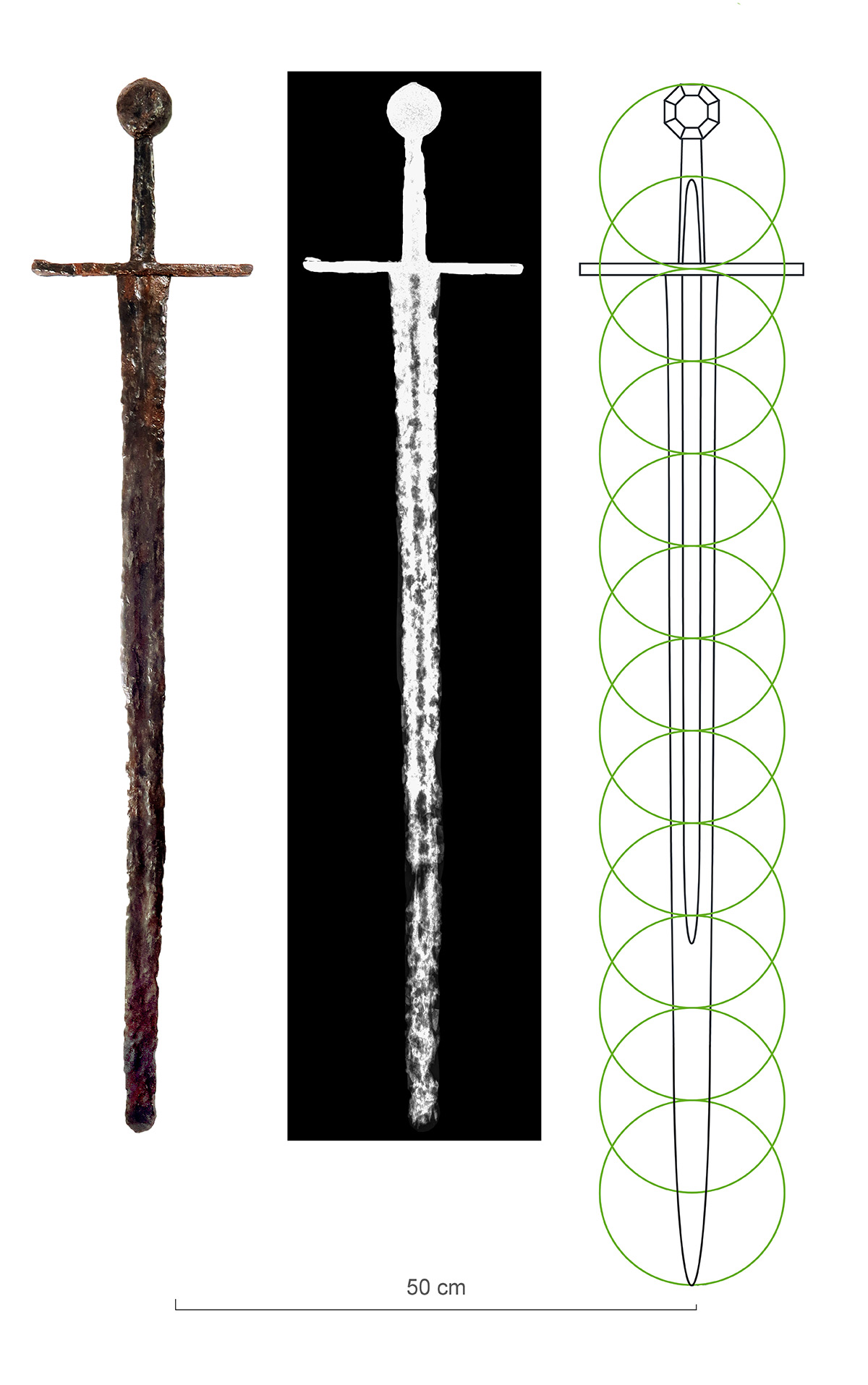 This specific sword was chosen for two reasons: Firstly, it was the only original sword that was accessible for this invasive kind of experiments. Originally it was intended to conduct more analyses like a polished and etched microsection for the composition of the blade. Due to the poor conservation this had to be cancelled.