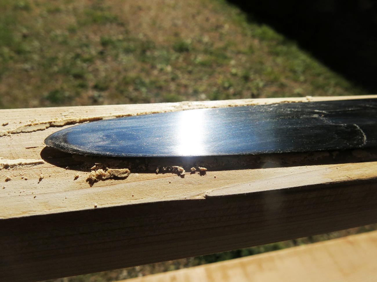 The tool made of hazelnut branches proved to be surprisingly effective and proved itself from the beginning. The elasticity of the wood allowed the pressure to be precisely transferred to the surface of the blade. The polishing tool did not need to be replaced during the tests but showed some wear towards the end where it touched the underside of the working surface.
