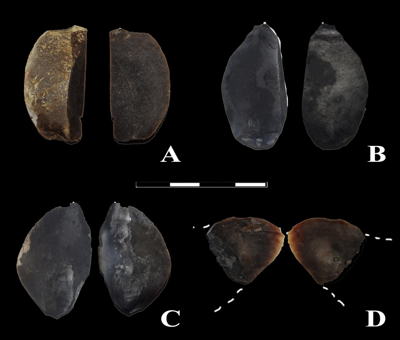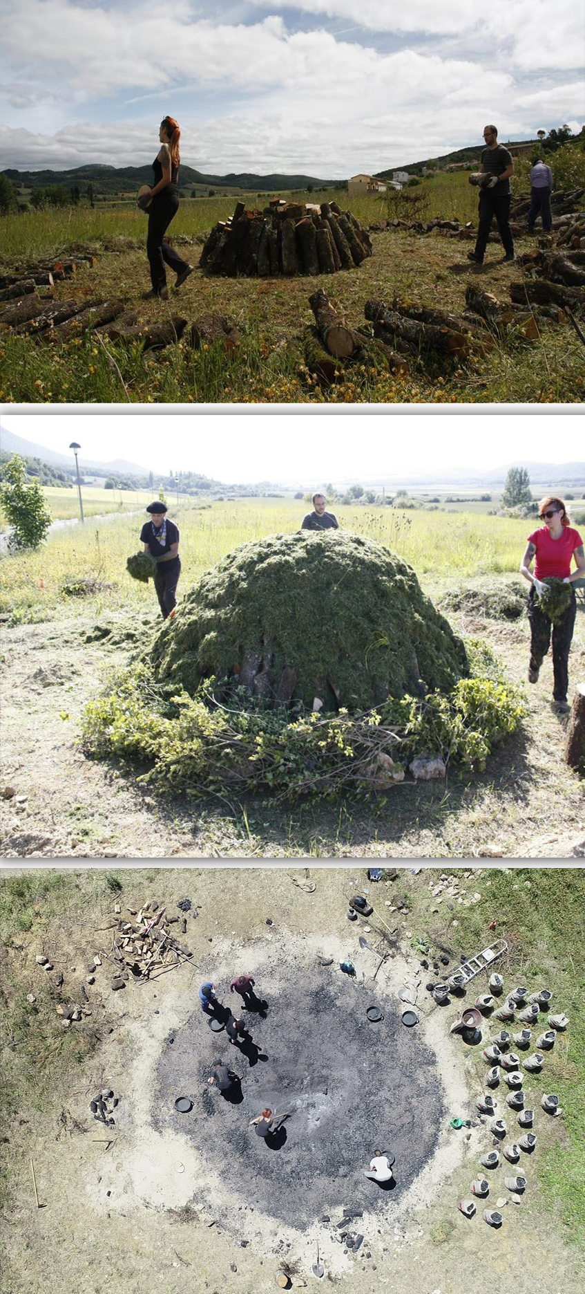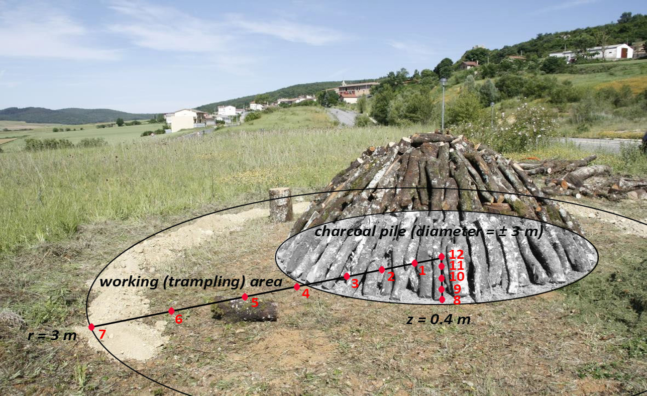 We were able to take advantage of an ethnographic experiment on Basque traditional coal production performed on June 2018 during a week in Bernedo, Álava (Basque Country, Spain). Despite not being an experiment focused on our goals, we believe that the conditions of time and temperature would be similar to those used in the extraction of flint nodules from Pozarrate. Due to the long duration of the experimental process, the temperature of several areas of the charcoal pile was checked with a laser thermometer at intervals. Therefore, several Treviño and similar Botorrita flint flakes (n=21) were placed on the surface at an initial stage of the experiment and recovered by archaeological methodology after the charcoal pile was dismantled (n=13).