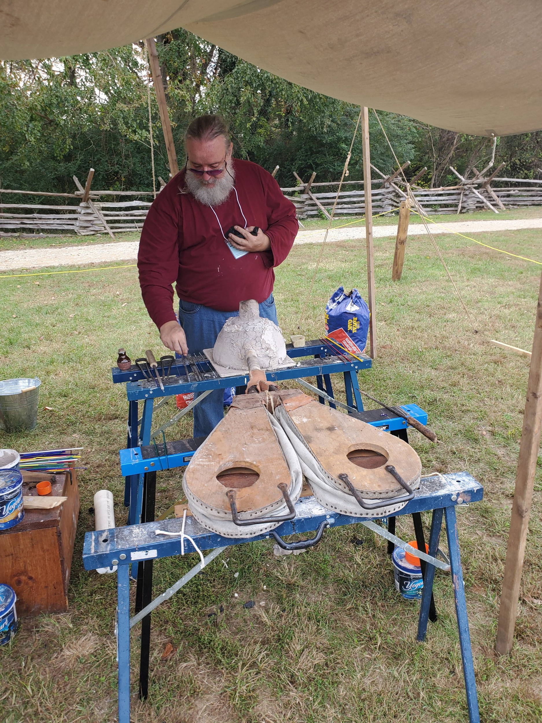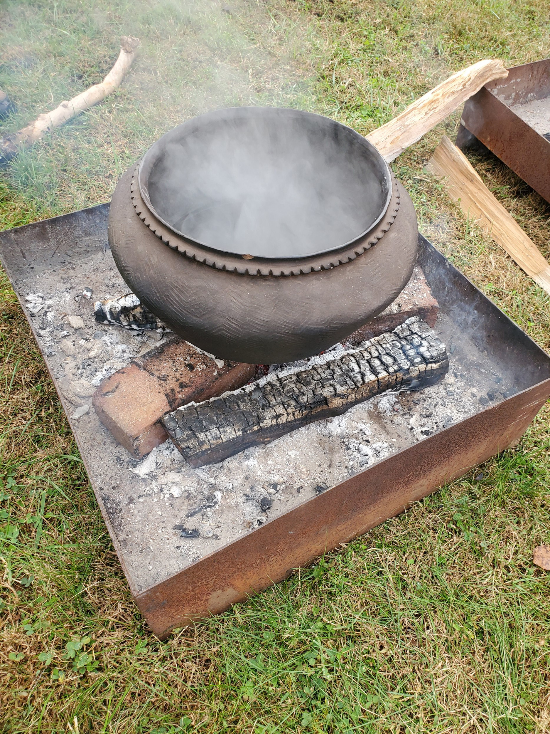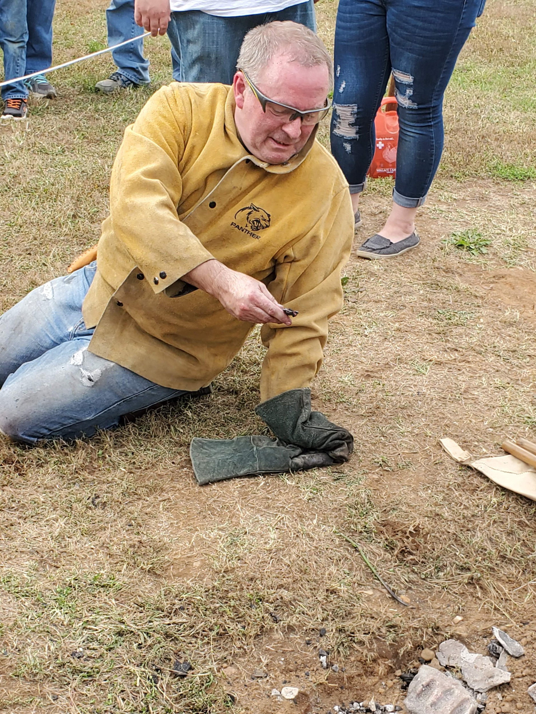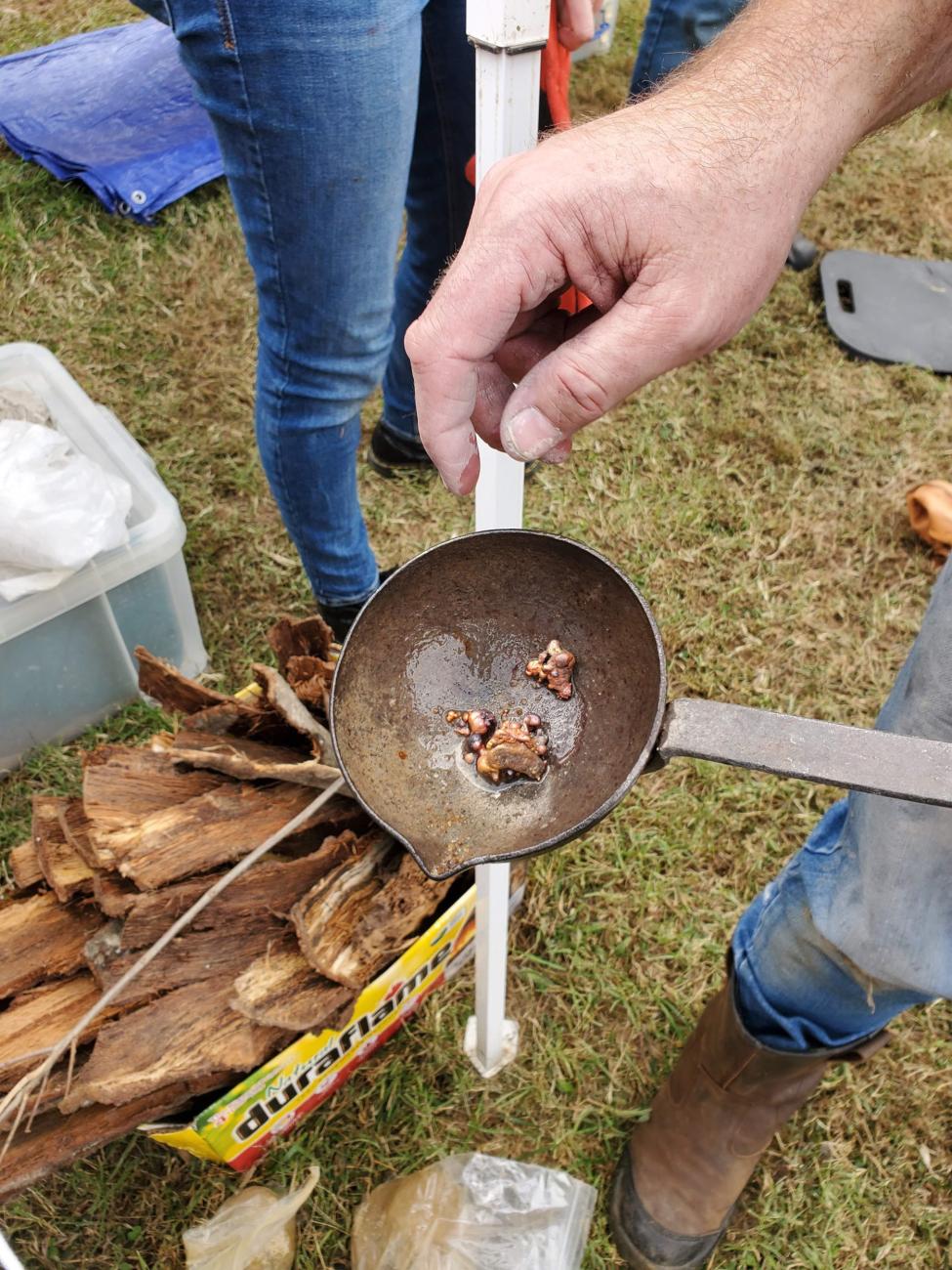Neil Peterson led many of us students in an interactive lesson of melting and forming glass beads over a small furnace. I felt lucky to be one of the few students who got to assist Fergus Milton with his bronze casting, spending nearly an hour and a half working the primitive bellows he had made in order to produce a small bronze axe head.