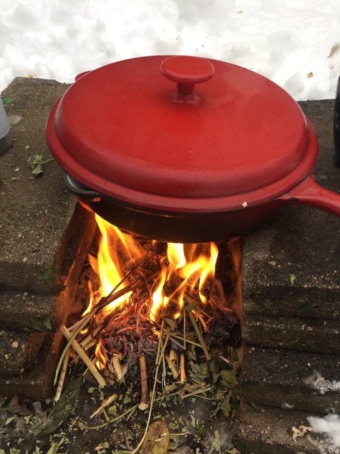 As for the cooking part, the recipes were translated by me for the most part, but I also relied on the translation by Vehling as a verification for my own translations, or as a source for the Vulgar Latin words I was unfamiliar with. Making these recipes coincided with many power outages due to a snowstorm, so I fashioned a simple fire pit in my yard from bricks and garden stones (See Figure 1). It was a very efficient way to cook, and easy to manage the fire from the front. It seemed the simplest, and most genuine way I could cook food over fire for these 2,000-year-old recipes. The pan I used was a heavy, cast iron model coated with ceramic- not exactly what they would have used in antiquity, but the closest I could get to an earthenware pot.