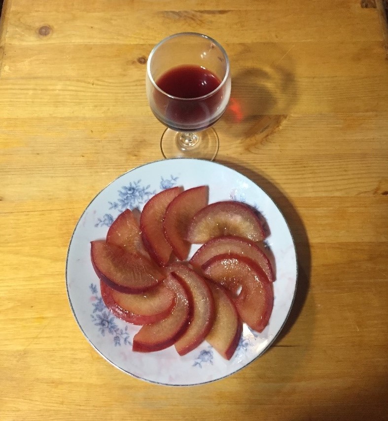 The ingredients in this recipe are peaches, and oil, along with a cumin infused wine. Translation was difficult for this recipe, as Persicis is referring to something Persian, and Persica means peach. One commentator thought it may have referred to a Persian fish (Starr, 2009, p.2467), but the recipe is in the fruit section, placed between a recipe for apples, and one for pears, and the instructions read like they are for a fruit more than a fish, so the translator went with peach (Vehling, 1977, p.2467). The peach was not cultivated in Rome until the first century CE, but became a valued fruit crop in the Mediterranean soon after (Zohary and Hopf, 2000, p.182). As it was a rare fruit crop, and probably only found in the gardens of the elite, it is doubtful that poorer people in Roman Italy would have utilised it in cooking. For that reason, I used some large plums that had a similar texture and hardness as a ripe peach, as plums were growing wild in Roman Italy (Zohary and Hopf, 2000, p.180). The rest of the ingredients were used for the reasons described previously. The fruit is supposed to be cut, stewed, and served with a bit of oil, along with some cumin infused wine. The recipe did not take more than five minutes to make, and it was simple enough to be convincing as a dessert for the poor. The taste of the cumin contrasted with the sweet plums was very enjoyable, and I could imagine that stewing the plums in cumin infused wine would have been even better.