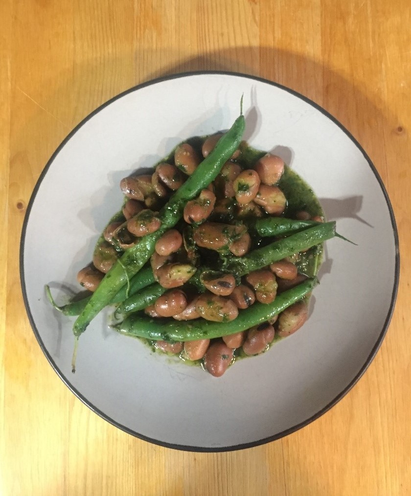 Ingredients for this recipe are fresh beans in a pod (presumably fava beans), pepper, lovage, cumin, green coriander, broth, wine, and oil. Fava beans were found locally, and have been abundant in the archaeological record for the Roman period (Banducci, 2018, p.133). Since it was too late to obtain fresh fava beans in the pod, I used shelled fava beans and immature green beans in a pod in order to get a sense of both flavours. Pepper was omitted, and lovage was out of season for acquiring fresh, so I omitted that as well. Cumin was cultivated at the time, and green coriander (cilantro) grew wild (Banducci, 2018, p.133), so I kept those. For reasons stated above, I kept wine, broth, and oil. Apicius writes to cook the green beans, so I just simmered them in a bit of water until bright green. Next the cumin, and cilantro were crushed in a mortar and pestle, and wine and broth were added to make a sauce, as per instructions. This was then added to the green beans in the saucepan with the fava beans, and some oil, and heated until hot. This was definitely the best tasting and most flavourful recipe, made with only a few simple ingredients.