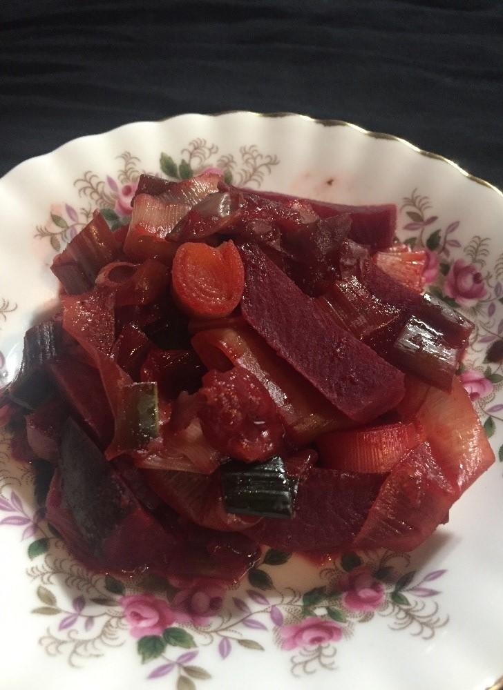 The ingredients for this recipe are beets, leeks, pepper, cumin, broth, and must. Beets are not found frequently in Italy’s archaeological record, but are native to the area (Zohary and Hopf, 2000, p.200). The same can be said for leeks (Zohary and Hopf, 2000, p.195). Remains of pepper and cumin are both rarely found as well, but pepper was imported, and cumin was cultivated locally (Zohary and Hopf, 2000, p.206). I therefore decided to keep cumin in the recipe, but omit pepper. Broth would have been easy to make, and must made from local grapes would have been accessible to lower social classes. The recipe mentions to add must to sweeten the dish, but I realised after I had cooked everything, that the beets were already sufficiently sweet, so it was excessive. Either Apicius wanted this recipe to taste as a dessert should, or the beets which he was consuming were not as sweet as the ones which I grew.