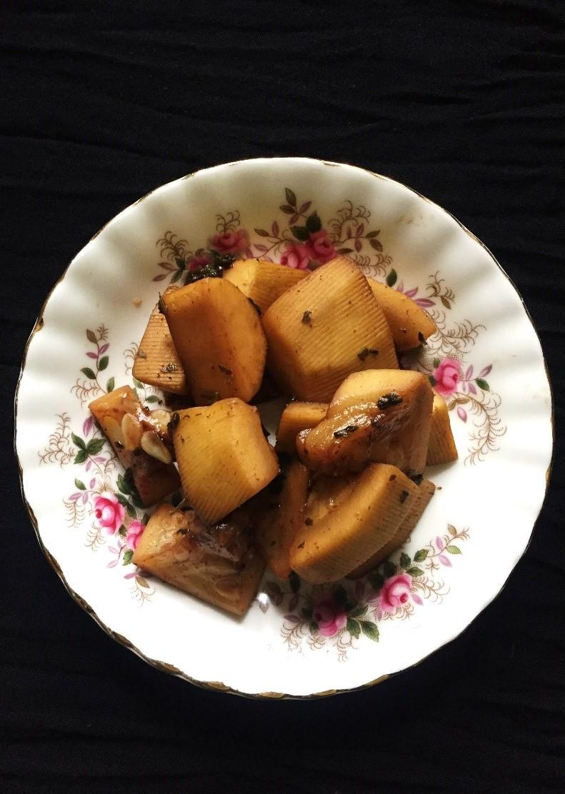 The ingredients for this recipe are bottle gourd, cumin, pepper, silphium, rue, stock, vinegar, and condensed wine. Remains of bottle gourd are rarely found from Italy, but it was grown locally, as discussed in the previous section. I kept cumin and omitted pepper for the reasons mentioned in the last recipe. Silphium and rue would have been found locally as well (Gowers, 1993, p.183), but I could not source them fresh, so I omitted silphium from the recipe, and replaced rue with another bitter herb, wormwood. Stock, vinegar, and condensed wine would have been relatively easy to access, and made with local ingredients, so I included all of these. Pliny (NH 19.24.71) says that though the rind of the bottle gourd is tender when the fruit is green, it is always peeled off when used for food, so I did peel the gourd first. Apicius says that harder bottle gourds should be boiled first to make them more palatable, but my gourd was fresh and soft, so I omitted this step. It is then to be cut up and placed into a baking dish. I used a ceramic coated cast iron pan. He says to add pepper, silphium, rue and cumin to a mortar. It is then to be mixed with stock, vinegar, condensed wine, and poured over the gourd. I omitted silphium, rue, and pepper, adding wormwood instead. It is to boil three times, and then be taken from the fire. The dish was done after about 20 minutes of cooking. It smelled fantastic, and the taste was okay. It was a touch bitter for my liking, so if I were to make this again, I would use less wormwood, considering gourd is already bitter itself. Silphium is even more bitter than wormwood, so if I had used it, I think it would have been unbearably bitter to eat, and the smell would not have been pleasant either. Anything else salty, sweet, or bitter added as a garnish would have overloaded the senses. The saltiness of the vinegar, and sweetness of the wine with a touch of cumin was very nice, yet it was still simple.