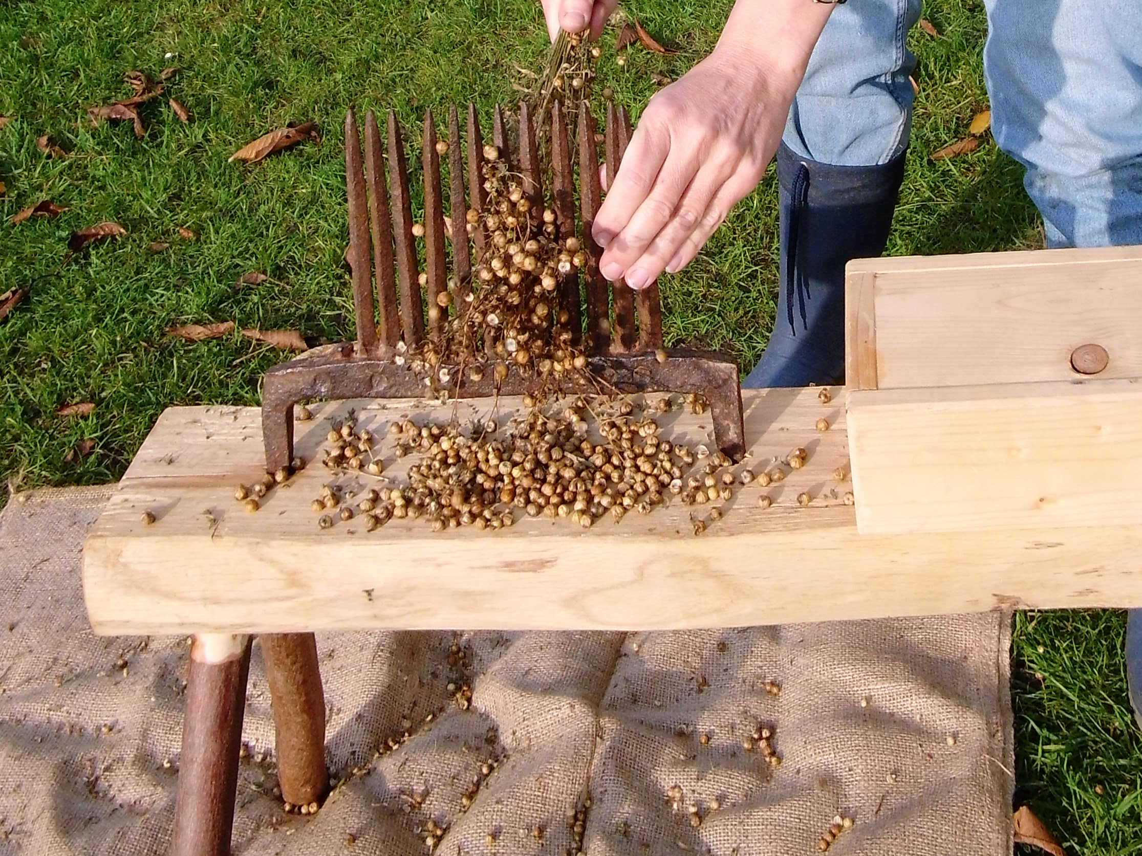 Several methods of removing seeds have survived in recorded history. The simplest recorded method was to beat the bundles of flax against a wall to remove all the seed vessels (Hagen and Tödter, 1985, pp.25-26). In my experiments, I found this method least effective as it takes longer and the seed vessels are dispersed further. This method requires no tools and is impossible to determine where or if this method was used in the Middle Ages. Threshing, used with cereals, cannot be used as a method as it damages the stems.