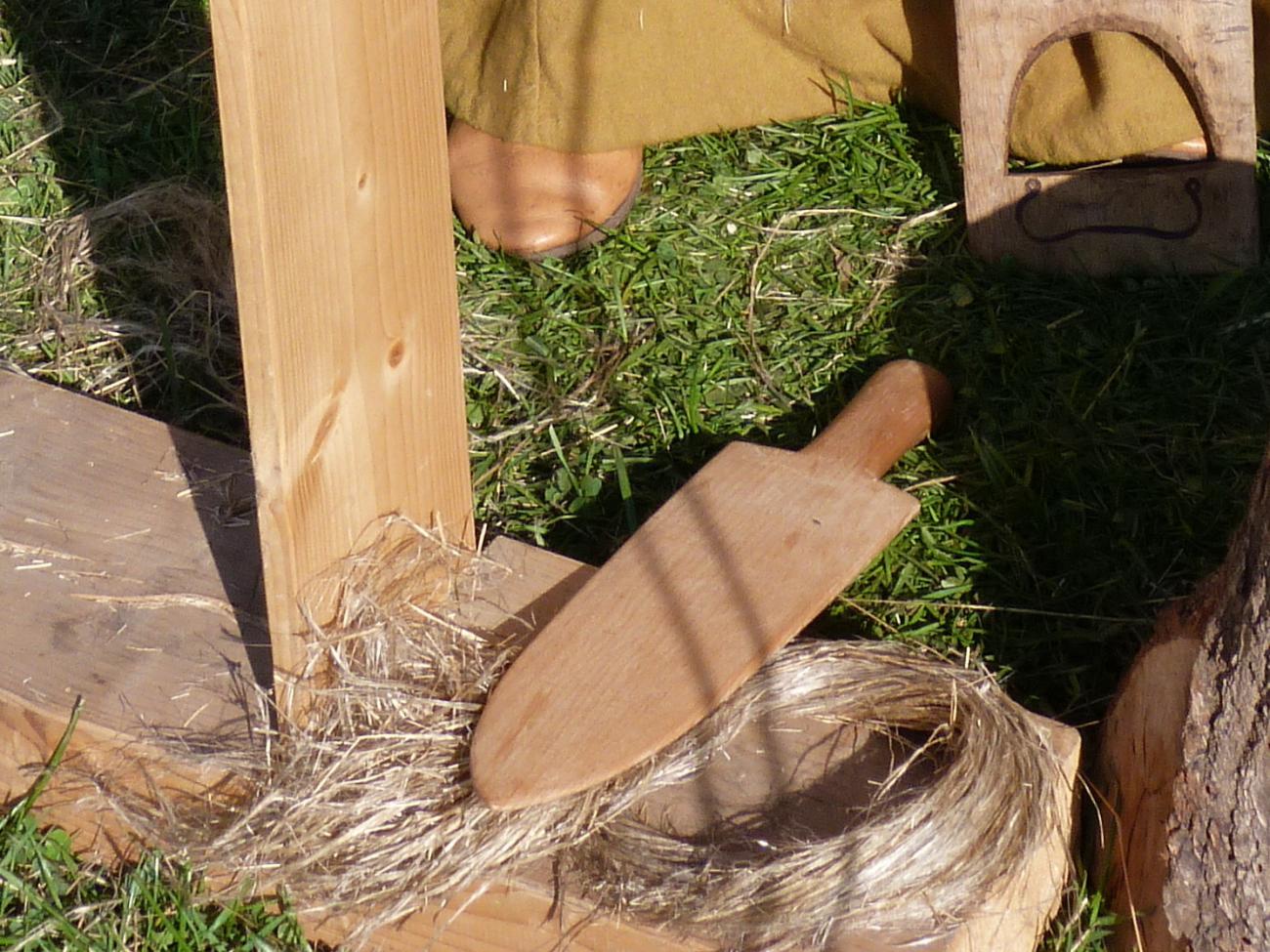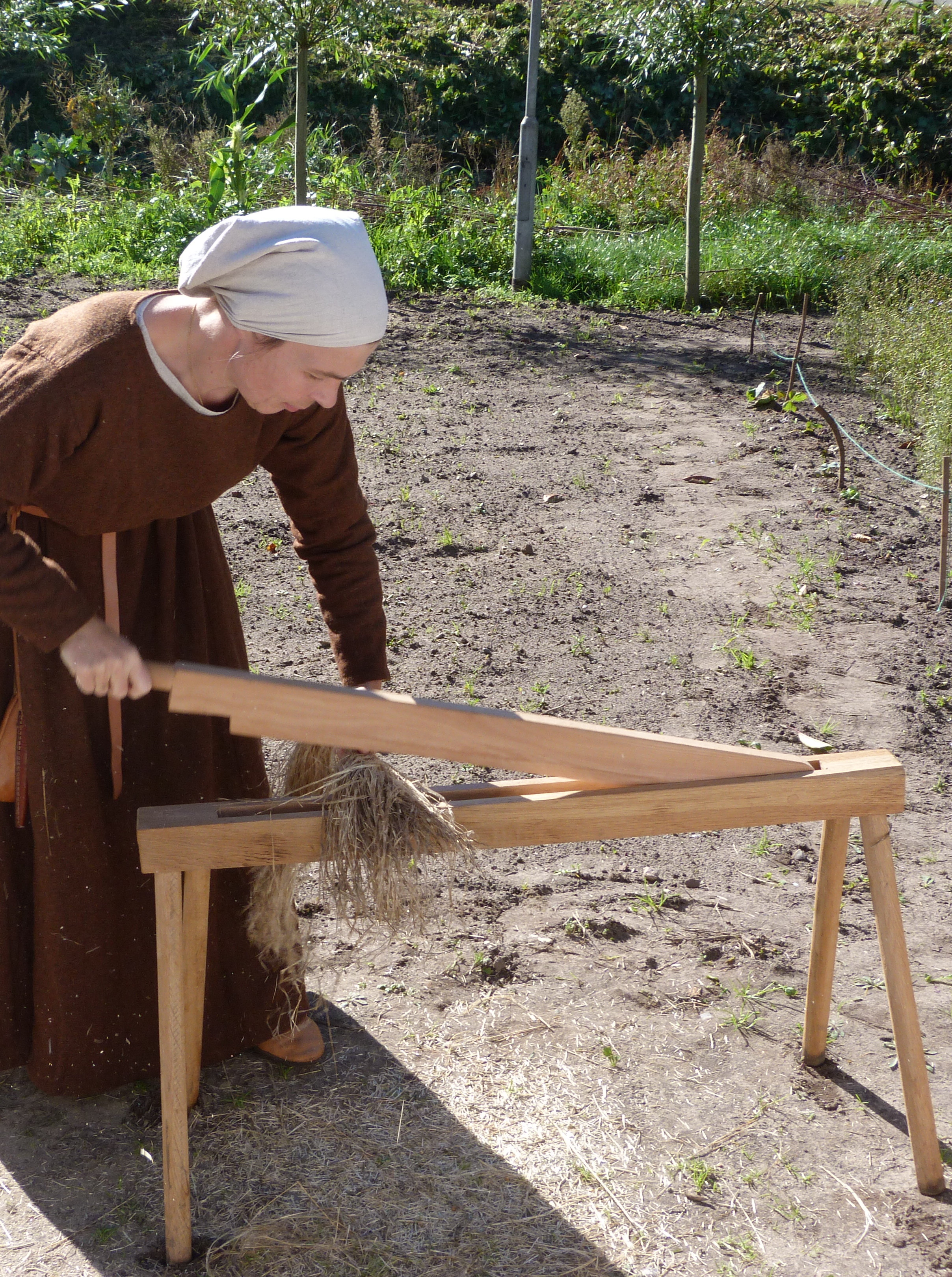 There are 13th century songs about scutching. The Kunkel house fresco shows a woman who is probably scutching and labelled “Thesens”, which is somehow connected to scutching (Wunderlich, 1996, pp.53-54). However she has the flax simply lying on her thighs and a scutching knife in her hands. My experiments with this method were not very successful, though I may lack some information or just practice.