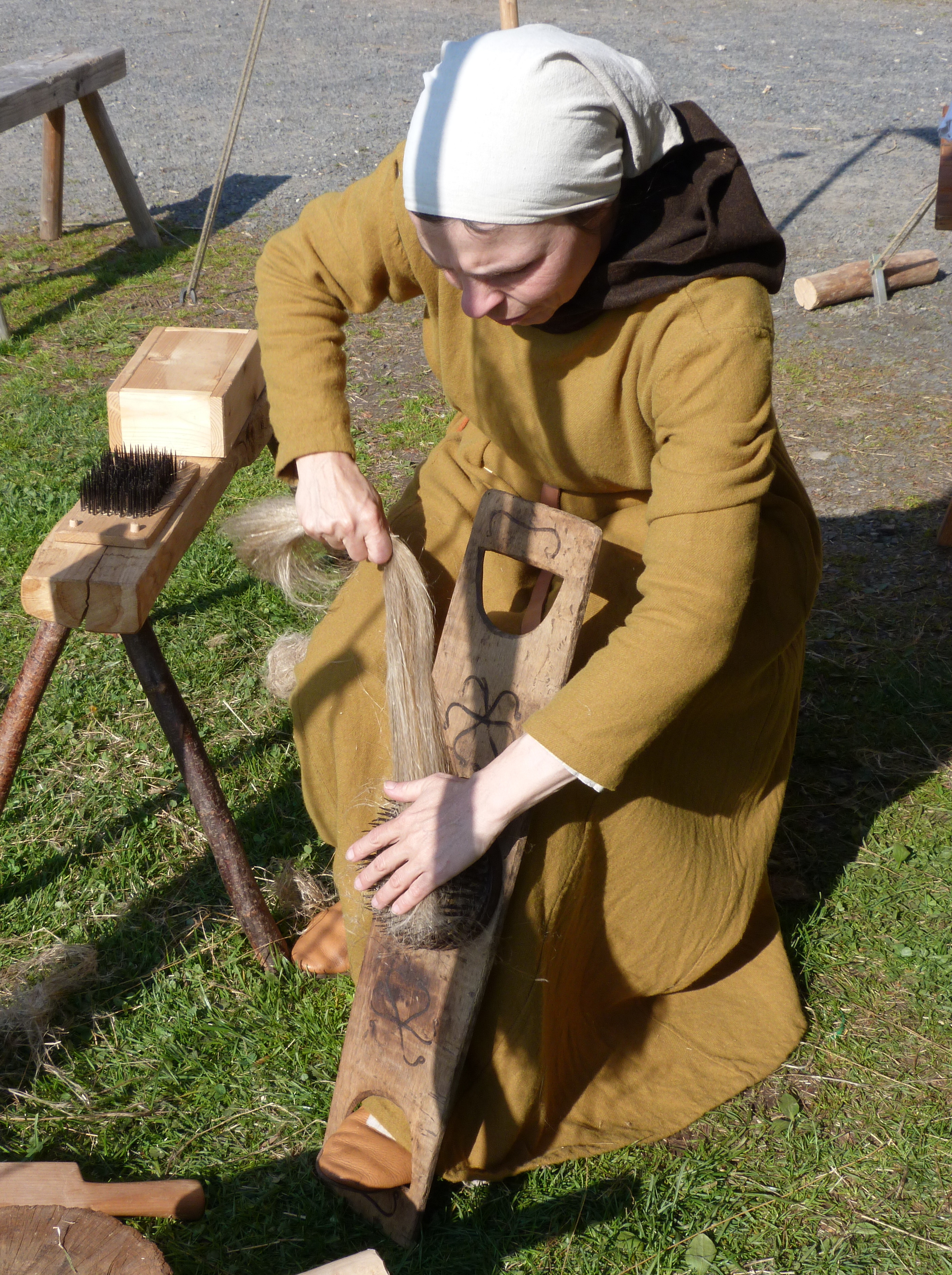 House Zur Kunkel and the cathedral from Chartres have depictions of hackling. The hackling comb itself has the shape that has survived to today. In the middle of a longish board, there is a round block with tightly fitted pointed nails. The flax is pulled through the comb to remove shives and short fibres. Unlike modern hackling were the comb is clamped into a light wooden frame, medieval depictions show women that have the hackling comb pressed against their knee.
