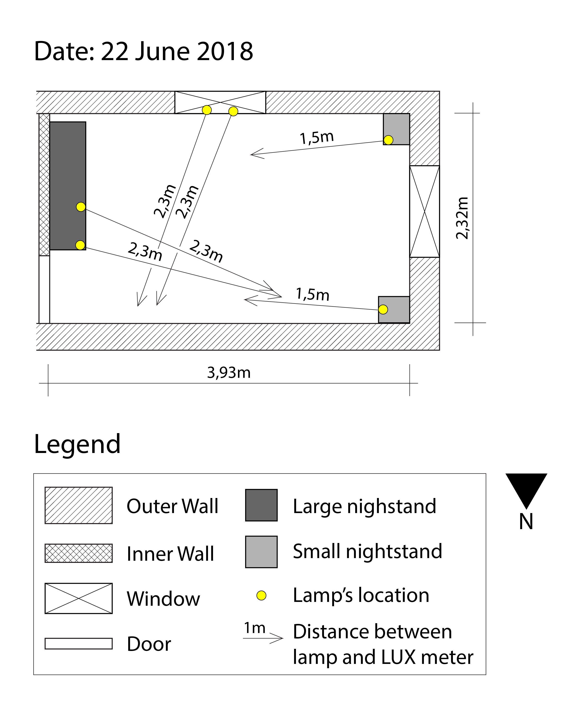 As seen in the lamp location plans (See Figures 2, 3 and 4), each time the lamps were in different places in the room. However, the intensity of light was measured identically each time, with a lux meter.