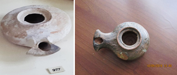 Notes: Lamp number 1—Early Muslim lamp (7th to 9th centuries AD); Lamp number 2—Clay lamp of Herod the Great epoch (1st century BC to 2nd century AD); Lamp number 3—Early Muslim lamp (7th to 9th centuries AD); Lamp number 4—Early Muslim lamp (7th to 9th centuries AD); Lamp number 5—Clay lamp of Herod the Great epoch (1st century BC to 2nd century AD); Lamp number 6—Roman clay lamp (1st to 2nd centuries AD)
