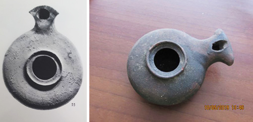We did not examine means used to extend burning time, as we assumed that it would be easy to do so by replacing the wick during burning. However, this is a desecration of the Shabbat, just the same as moving the wick or pouring oil into an already-burning lamp. Another solution is an additional mechanism inside the lamp, which is known from archaeological excavations, as seen in this luminary dated to the 1st century BC which was found in the archaeological excavations at Beit Natif and Herbet Otza (See Figure 13).