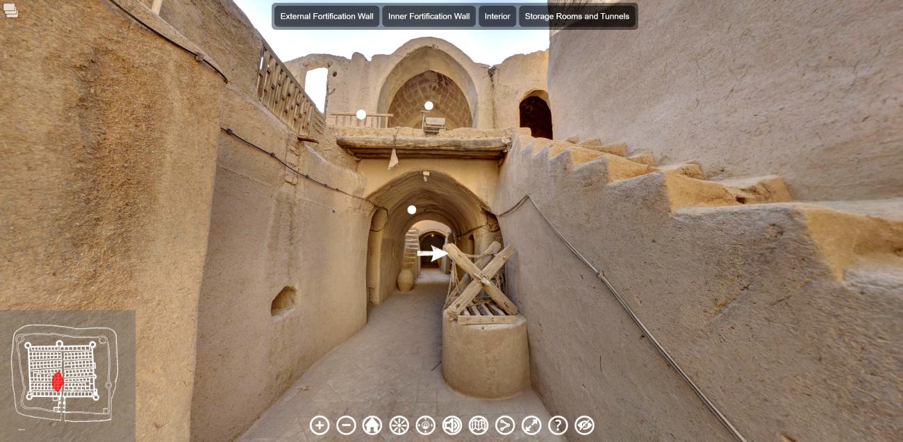 The virtual guided (See Figure 11) tour will allow a visitor who has never been in Saryazd to walk there virtually on a PC, mobile device or with virtual reality goggles. The scenario will follow a general route, revealing the essential aspects of the ground plan, architecture and fortification. A map will facilitate the route by showing the position of the visitor at any given moment.