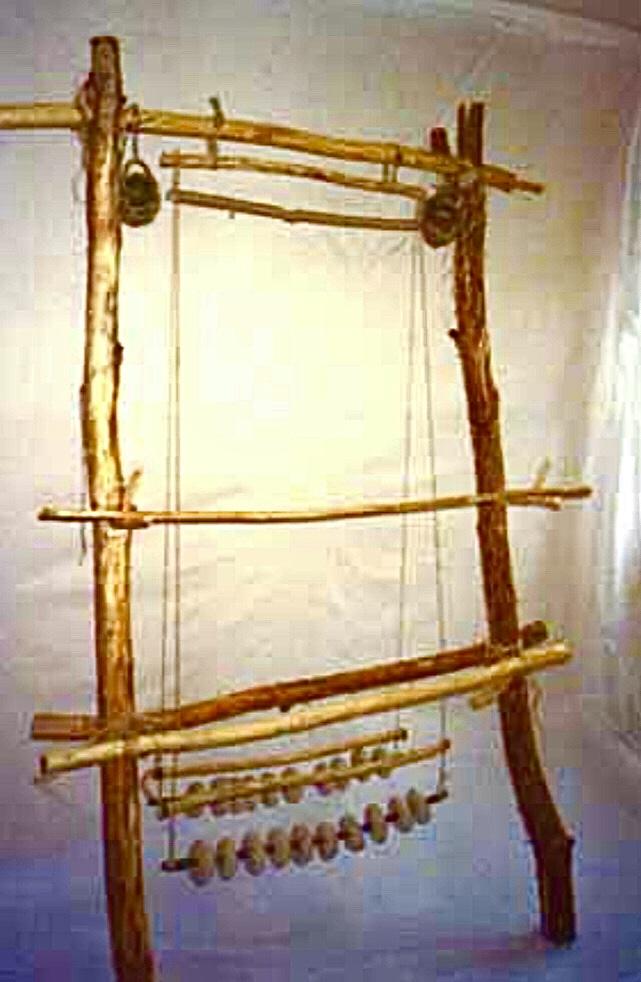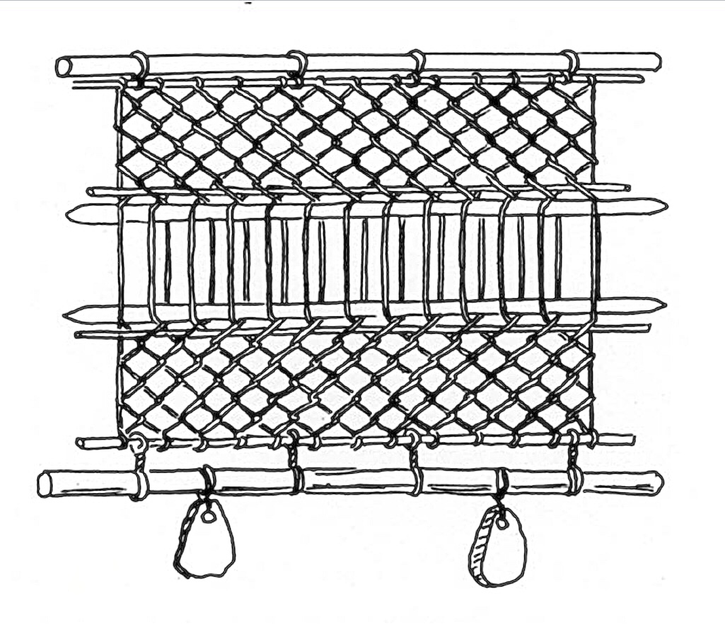 Research inspiring this weaving experimentation includes in particular two types of weaving loom. The first is of the sprang technique, in which two loom weights were placed on the lower beam (See Figure 2). The second type is the weaving loom of experiment of the Orkney Hood hooded cloak, where the loom weights weighed down the warp indirectly (See Figure 3). Guiner (1984, Fig. 2) describes the sprang weaving technique as using certain heavy loom weights and textiles discovered in Spain, and compares these findings to the loom for sprang, on which two loom weights were applied, which are however dated to 800 AD, found in the Oseberg ship burial in Norway. The same type of loom is also proposed for the Iron Age giant loom weights found in Sardinia (Melis, 2014). Also relevant to this study is an interesting experiment, conducted in Marle at the Musée des Temps Barbares (Nice, 2009) on Merovingian weaving looms from Goudelancourt, France. The loom employed in this experiment was modelled on the Oseberg loom. The looms employed in this experiment were modeled on the Oseberg loom and on the drawdown loom in the Carolingian Utrecht Psalter.
