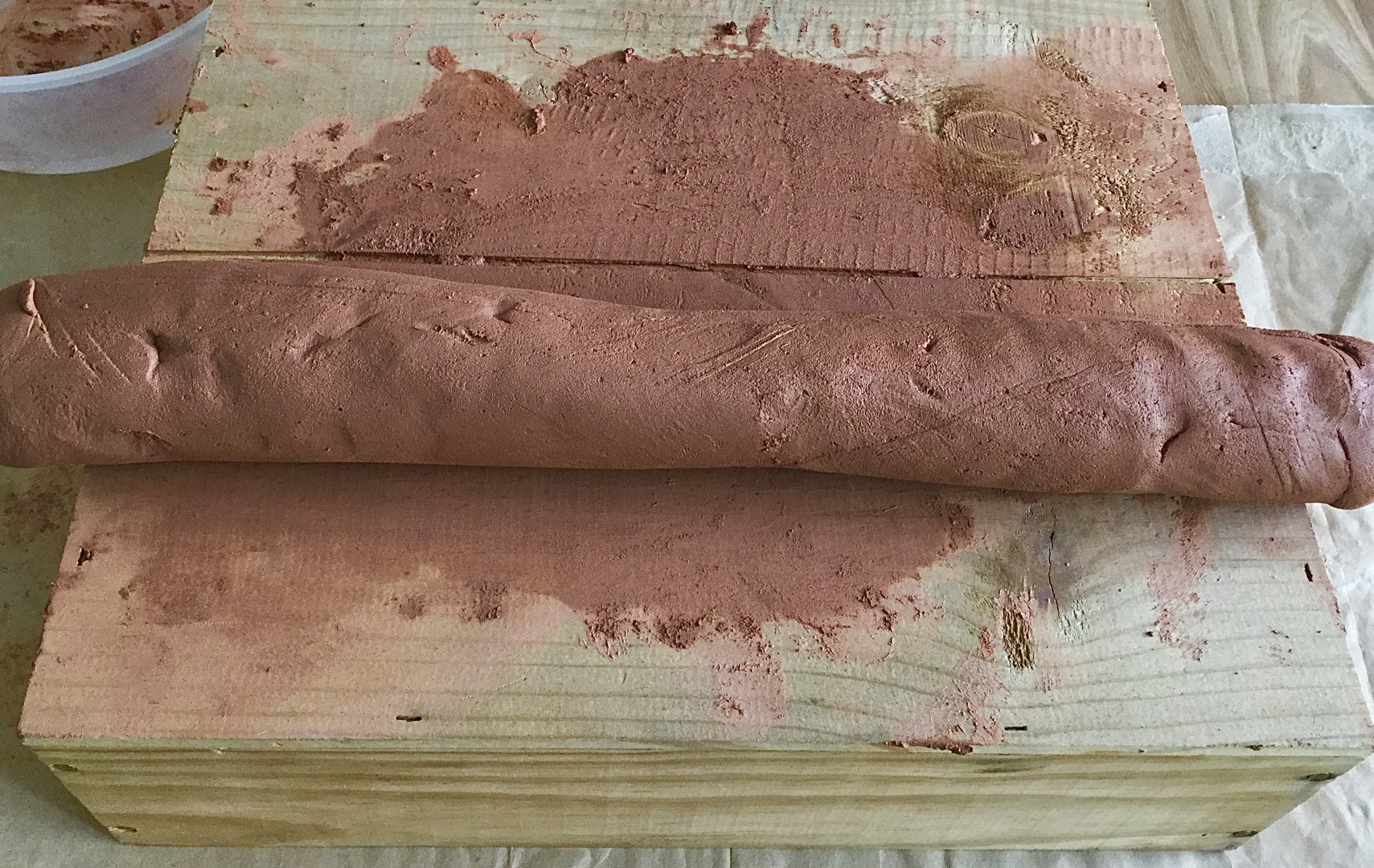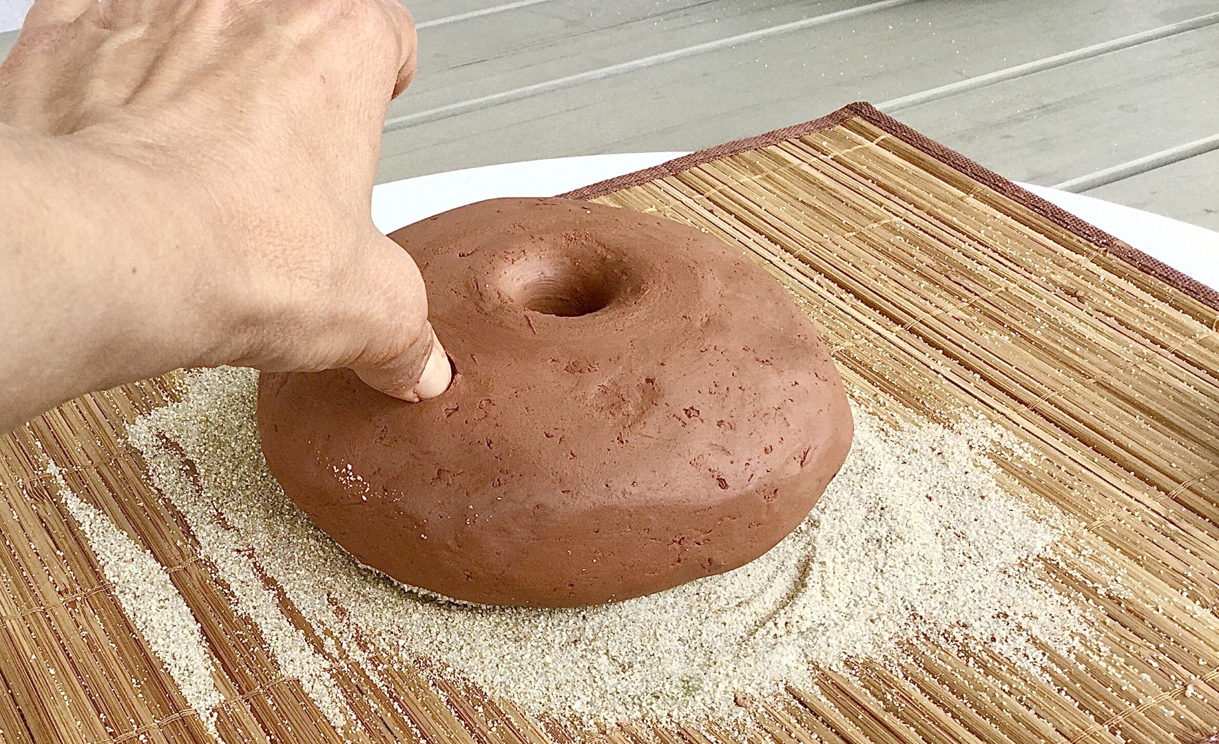 Based on macroscopic observations, the loom weights appear to have been modelled using multiple techniques, and with the aid of tools such as a potter’s wheel, a stick, and a mold. In the case of the second technique, a colombino, or a 6 cm thick and 40 to 50 cm long clay roll (See Figure 4) is arranged in the shape of a doughnut and pressed in a concave mold similar to that of a bowl, but of which the diameter is greater to that of the loom weight itself (See Figure 5). The rest of the process is then undertaken on a wooden desk and the loom weight is modeled on its sides into a biconical shape. In the case of the first technique, a ball of clay, created by tapping the clay with the palm of the hands, was placed on the wheel. The central hole was created by using a stick, of about 2 cm in diameter. Vertical pressure and rotational movements are used to widen the hole and the final refinements are rendered with the fingers.