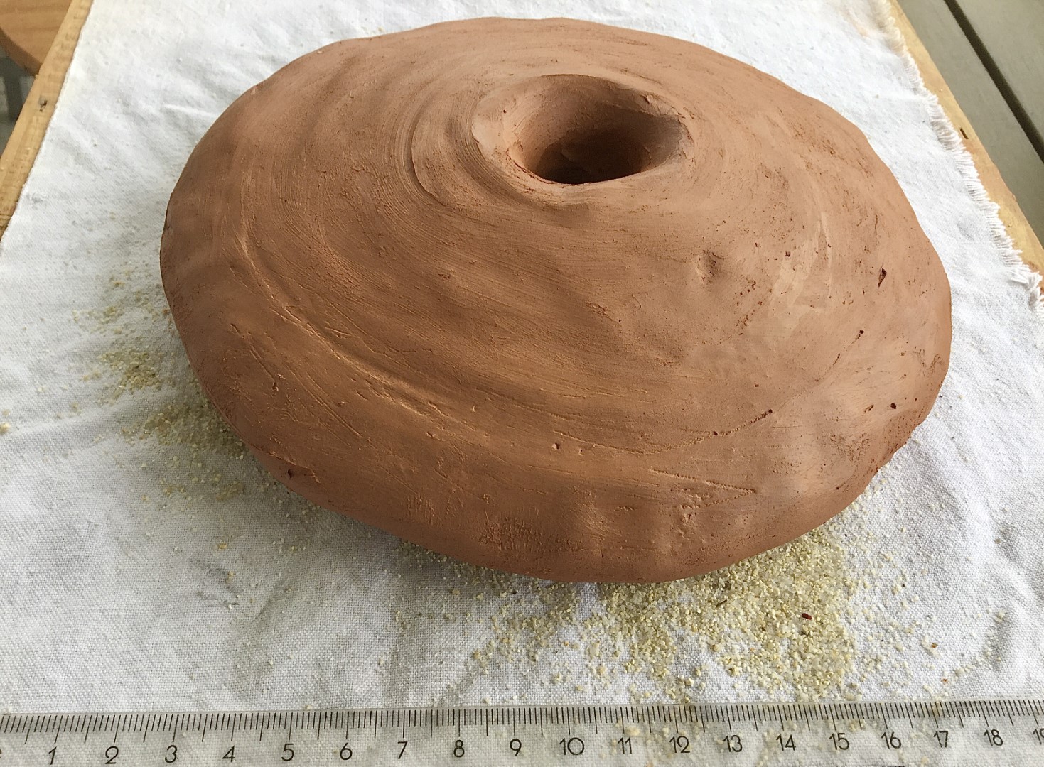 LW3 is the lightest doughnut-shaped loom weight of the three discussed pieces. It has a slightly irregular biconal shape, and a smaller central hole than that of LW2: 2.8 cm as opposed to the latter’s 5 cm. It also has rounder edges than LW2. The color is of a lighter orange shade, presenting a slight yellow-orange tinge all across the surface, which could in fact be a thinner layer of clay spread on the loom weight, prior to firing. It appears to have been immersed in a more liquid clay, to refine and smoothen the surface before firing. However, this kind of thin clay veil remains significantly abraded and therefore could also be a consequence of usage, light exposure, soil oxidation or a firing characteristic. To recreate the loom weight LW3, a potter’s wheel was used, starting from a ball of refractory clay, calculated as in previous experiments with 85% clay and 15% grog, and using the same ingredients. The modeling was achieved by rotating the wheel whilst attempting to press down with the fingers, and thus flattening the sides and rendering the irregular biconic outline. In order to perforate the loom weight, the same 2 cm stick was used to exert pressure vertically, during the rotation procedure, whilst simultaneously tilting slightly to widen the central hole. Compared to the modeling process of LW2, the pottery wheel allows for the creation of loom weights with equal and even outlines, even though the execution and result was less successful than when using the bowl mold (See Figure 8). It is believed that, most likely, both a mold and a wheel were used to complete the modeling and shaping of the loom weight. The drying method remains the same to that of the previous experiments.