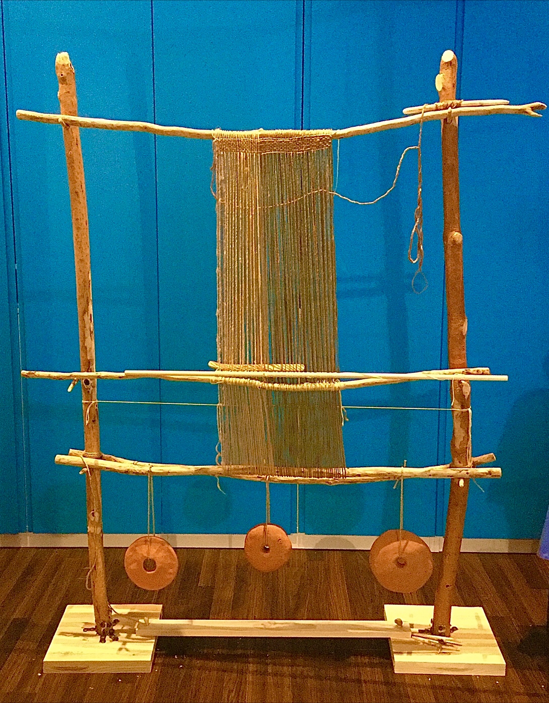 This weaving loom consists of a combination of two types of weaving looms: the warp-weighted type and the double beam type. Two of the three reconstructed giant loom weights, LW1 (1,346 g) and LW3 (1,543 g), were not attached to the warp threads, but were rather used to weigh down the lower beam on which the warp is wrapped.