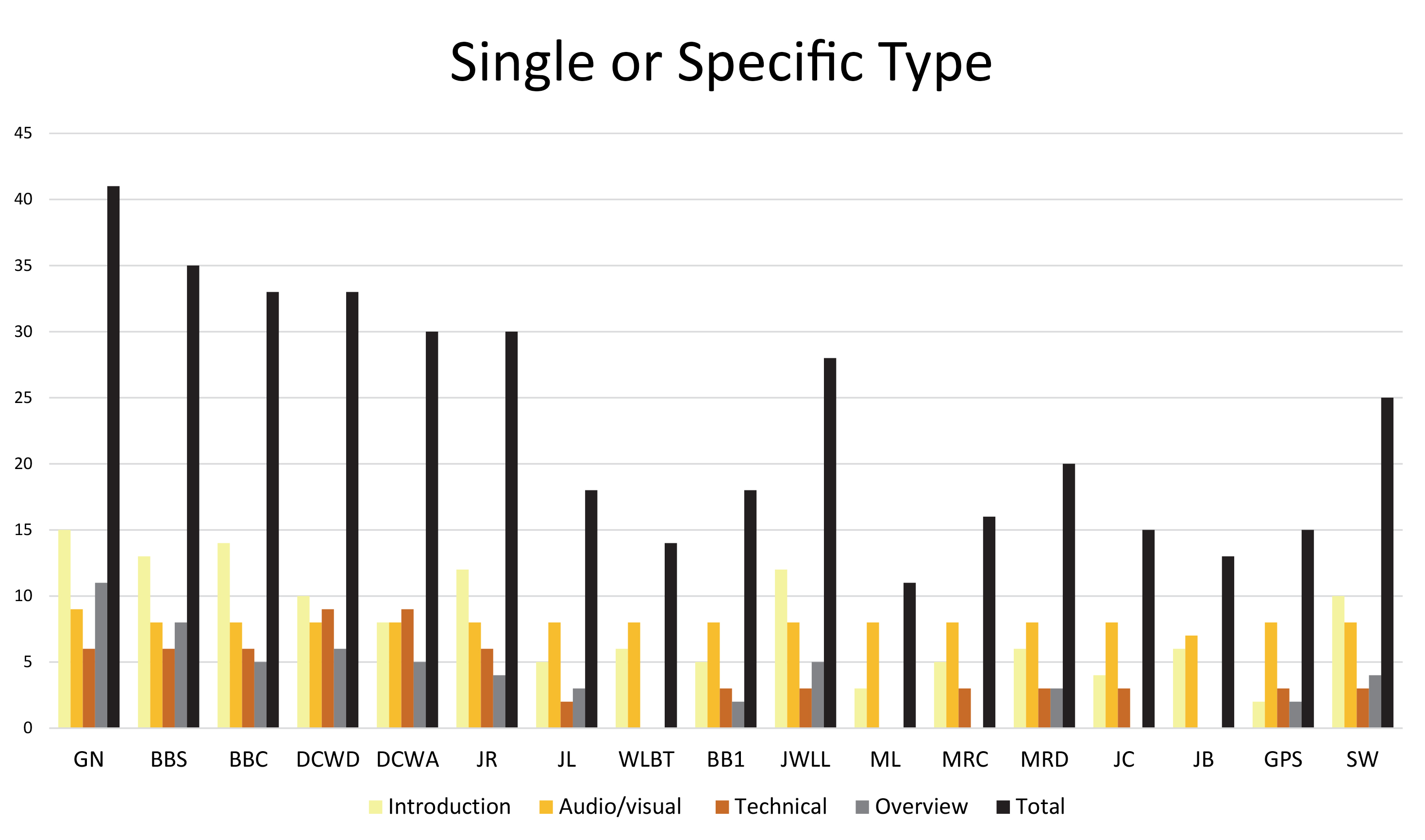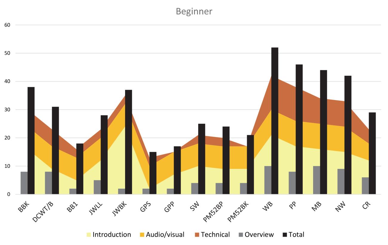 - Single or specific type (videos created to explore a specific artifact form, or technique were not rated in areas that were not applicable as they are specialized and not “general” videos)